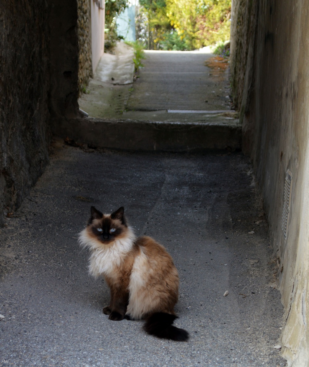 Après avoir stationné ma voiture sur le parking de la mairie, je suis partie un peu au hasard à l’assaut de la butte qui domine le village. J’ai croisé quelques chats au regard interrogateur. J’ai fait demi-tour au fond de plusieurs impasses. Mais, finalement, j’ai fini par trouver une rue en pente qui se poursuivait par un chemin piéton.