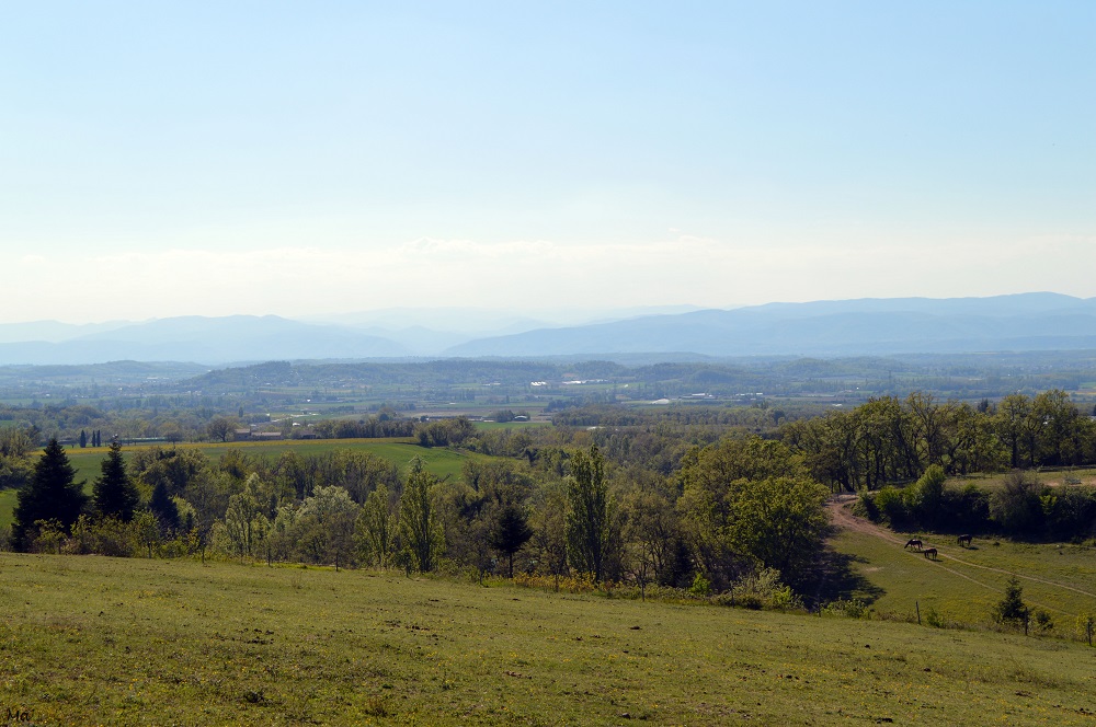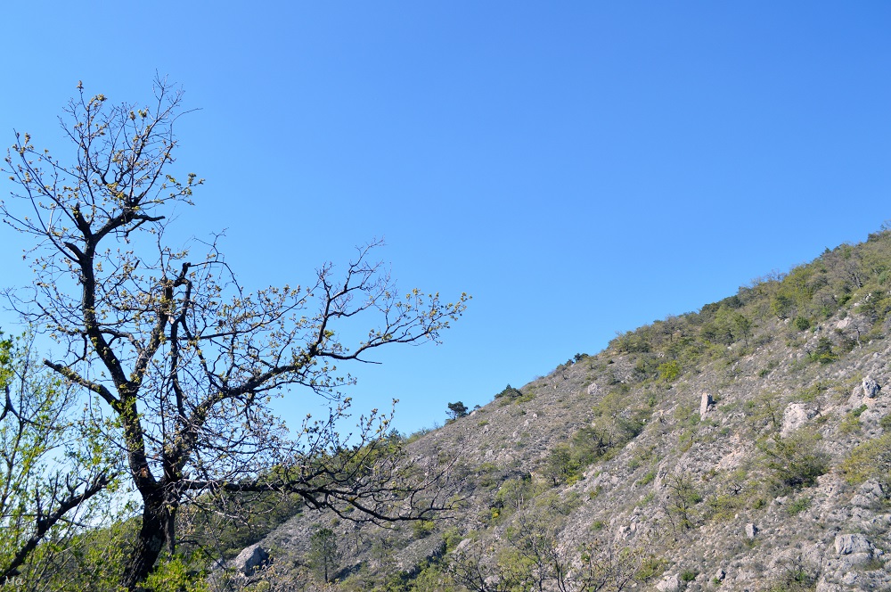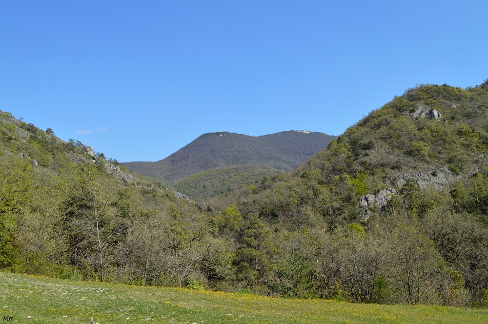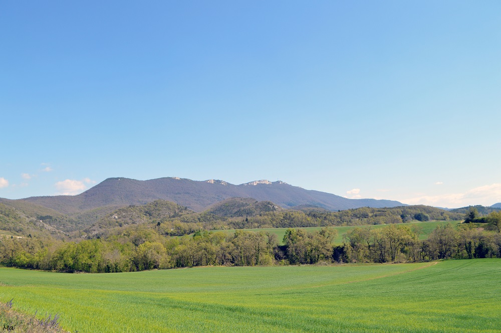 Je me suis approchée du bord du plateau. Le paysage se déployait, grandiose, à mes pieds. De là, la vue embrasse le synclinal de Saoû, les gorges d’Omblèze et le plateau d’Ambel, le Diois, et porte même jusqu’au Dévoluy. Le banc au pied de la croix invite à la contemplation. Alors, je me suis assise. J’ai sorti ma thermos de café. Et tout en me réchauffant du vent glacé, j’ai admiré les silhouettes des montagnes.
