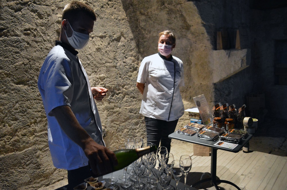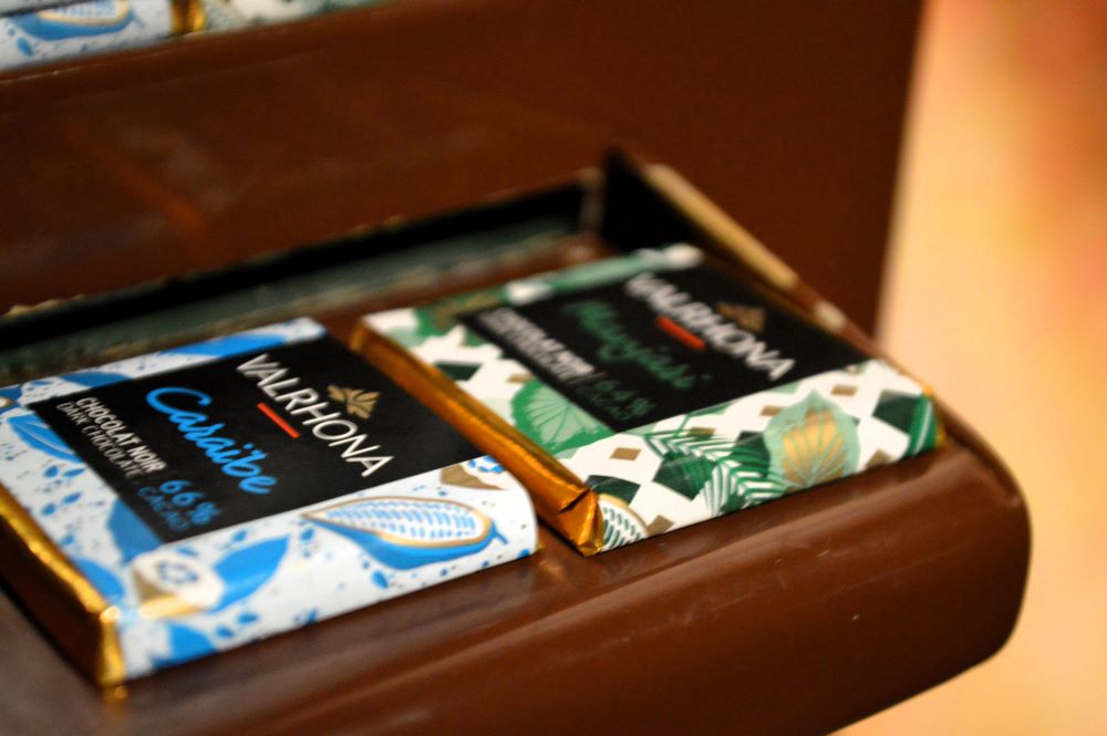 Pour nous réconforter face aux aléas météorologiques, l’office de tourisme a demandé à Vincent Durant de nous accueillir, et il a gentiment accepté au pied levé pour notre plus grand bonheur. En effet, Vincent Durant est Meilleur Ouvrier de France chocolatier. De plus, il s’inscrit dans une démarche de promotion des produits locaux en sourçant au maximum ses matières premières dans la région. On trouve ainsi dans ses chocolats du beurre et du piment de Bresse ou encore des graines de tournesols d’un agriculteur de la région. La provenance est d’ailleurs indiquée sur les étiquettes des chocolats dans la boutique. Il cherche en outre à minimiser les kilomètres parcourus par ses emballages (produits donc à proximité) et à les rendre réutilisables. Pour cela, presque tous ses chocolats ont la même forme, celle d’un petit palet. Ainsi, ils peuvent tous prendre place dans les petits plateaux thermoformés empilables spécialement conçus pour Vincent Durant. Même les jolis petites grenouilles en chocolat ont des dimensions adaptés pour s’y insérer. C’est avec beaucoup de générosité que Vincent Durant nous a fait découvrir l’étendue de sa gamme, des chocolats aux associations insolites aux boissons maison (cola et kombucha) en passant par les pralines multicolores à l’enrobage fruité. Et tout était délicieux !