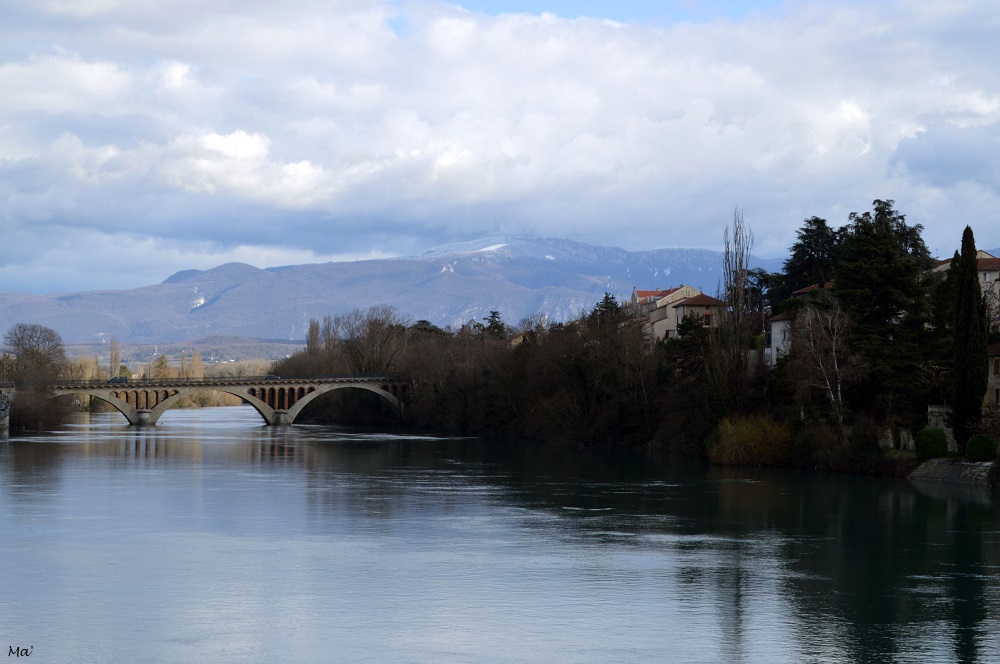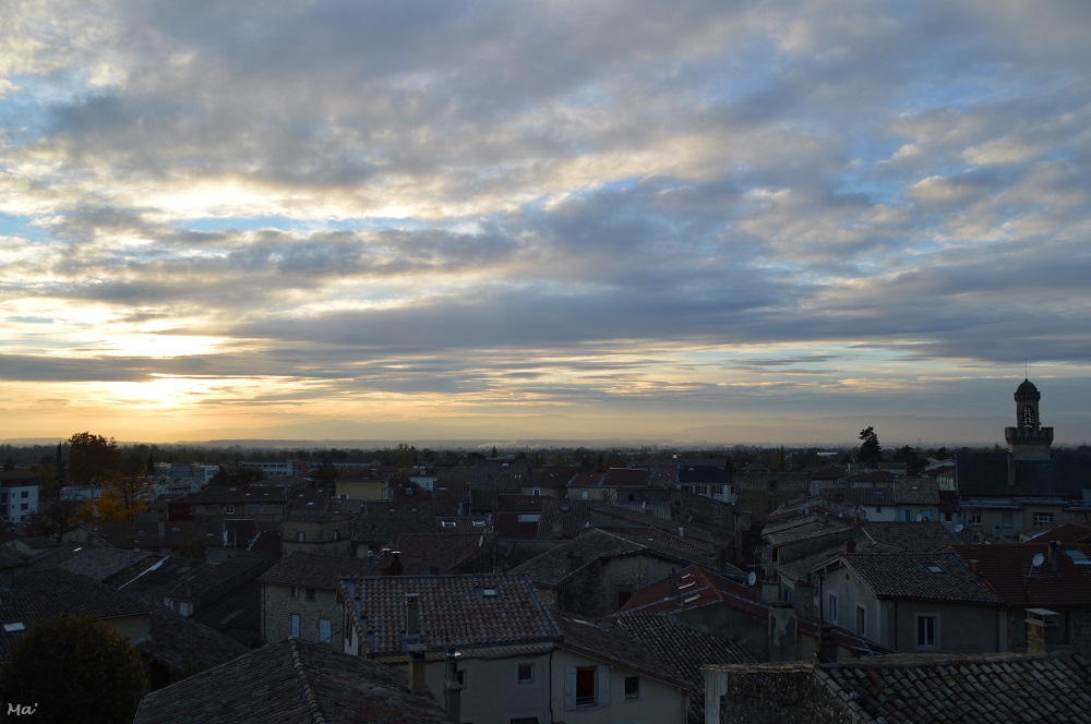 Au loin, au delà de la plaine de Valence et du fleuve, la silhouette de la montagne de Crussol et des monts d’Ardèche se dessine légèrement tandis que le ciel s’obscurcit au dessus des toits de tuile.