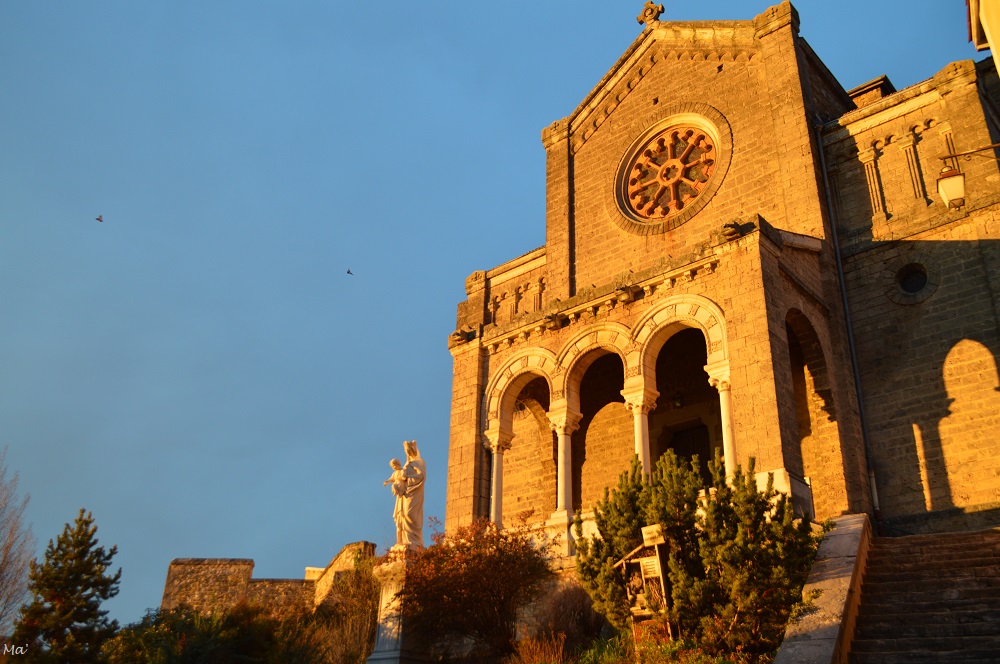 Doucement, le soleil descend vers l’horizon. Le ciel prend des teintes orangées juste avant que l’astre ne se cache derrière les montagnes. Un dernier coup d’oeil à la Vierge du Voeu et il est temps de redescendre.