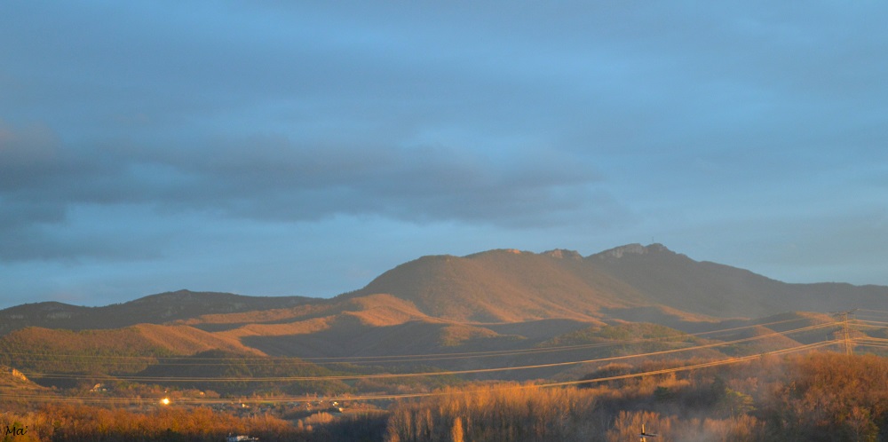 Comme le soleil commençait déjà à être bas, le château était dans l’ombre alors je suis partie de l’autre côté de la montagne chercher la lumière. A l’entrée du site de Crussol, j’ai donc pris sur la gauche, en direction du site d’escalade Top Secret. Très rapidement, j’ai de jolis points de vue bien dégagés sur Saint Péray et le château de Beauregard (où j’ai eu l’occasion de passer de bons moments il y a quelques années avec des copains – je me souviens en particulier d’un chouette déjeuner qui avait des allures de fête sous les arbres de la cour).