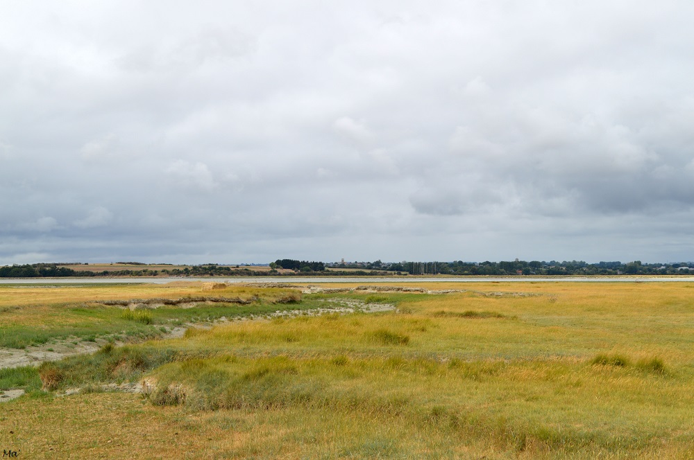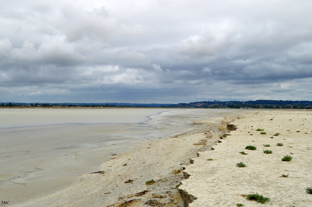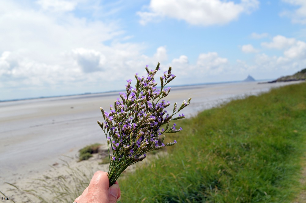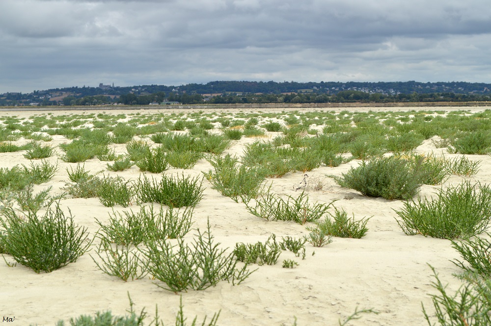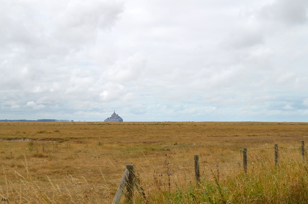 Depuis le chemin d’approche, on voit déjà le Mont Saint MichelTout autour, les champs ont été moissonnésJe n’ai pas souvenir d’avoir déjà vu l’herbu aussi jauneSur le rivage…A l’approche du lit des fleuvesSalicornes sur sable