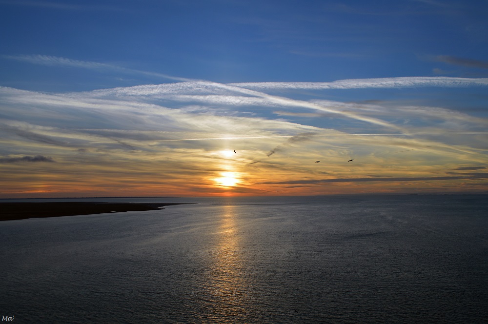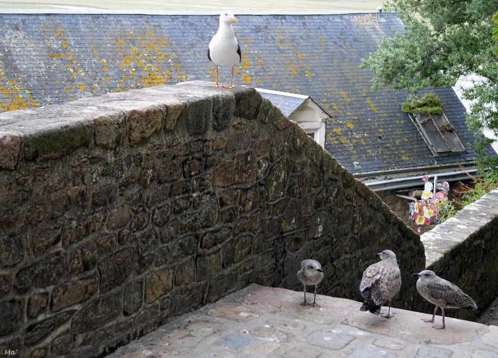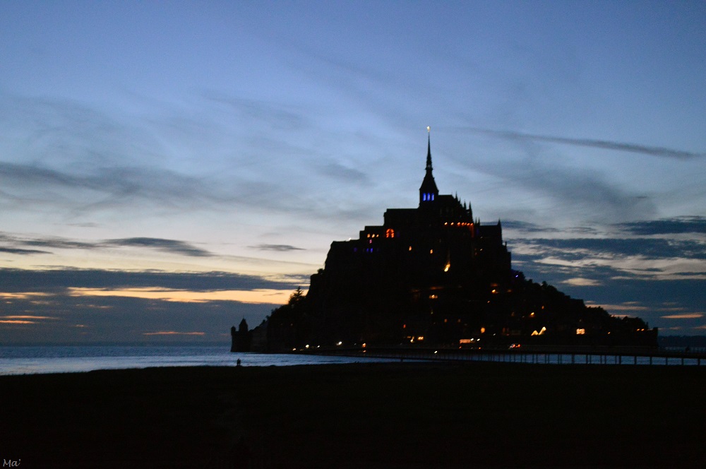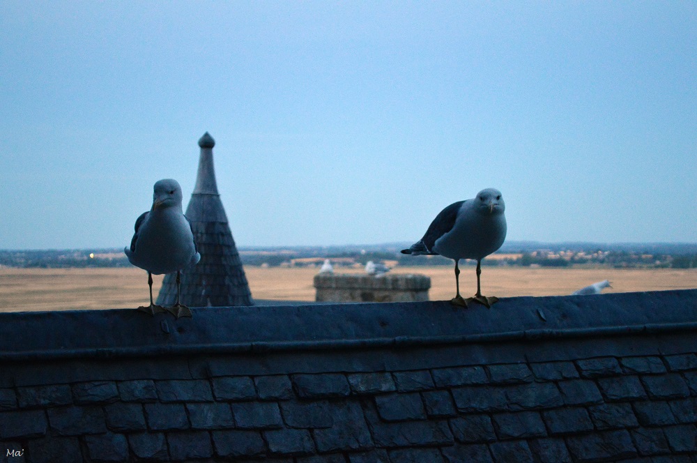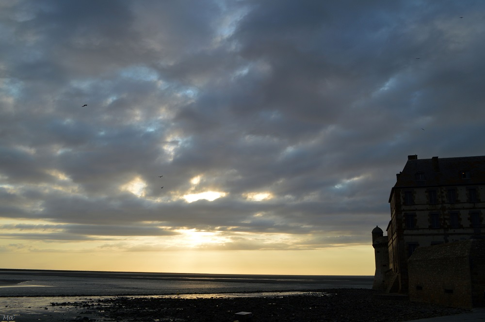 En descendant de la navette Le Passeur à l’arrêt Mont Saint Michel Dans la salle des hôtesDans le cloîtreLa mer commence à entourer le Mont Saint Michel tandis que le jour déclineCoucher du soleil sur la merGoélands sur les toits (attendant que les touristes les laissent un peu tranquilles pour la nuit ?)Au pied de l’abbayeFin de journée dans la BaieQuand le Mont s’apprête à dormir…