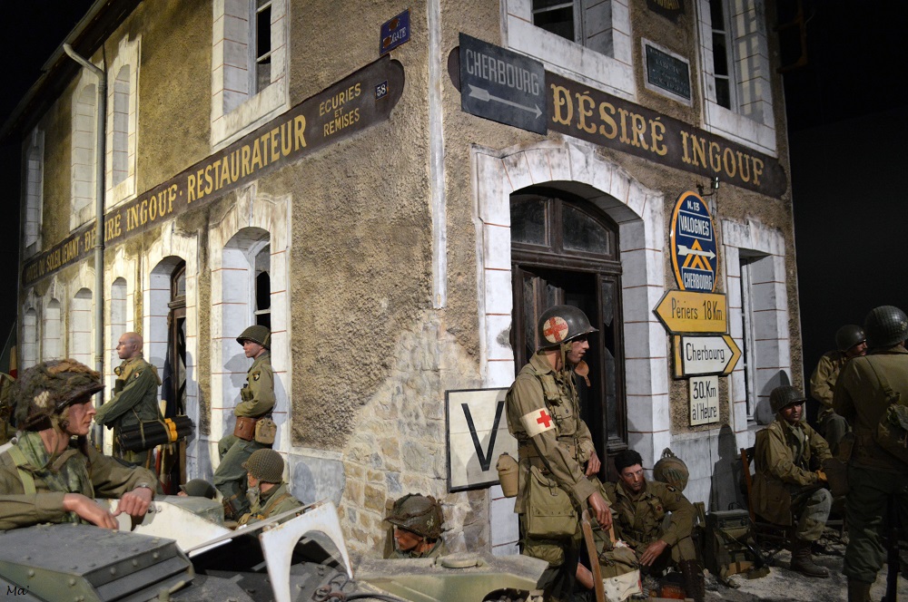 Sainte Mère Eglise – MancheSimulateur de vol – D Day Experiencereconstitution d’une scène de rue photographiée en juin 1944 à Carentan– D Day Experience