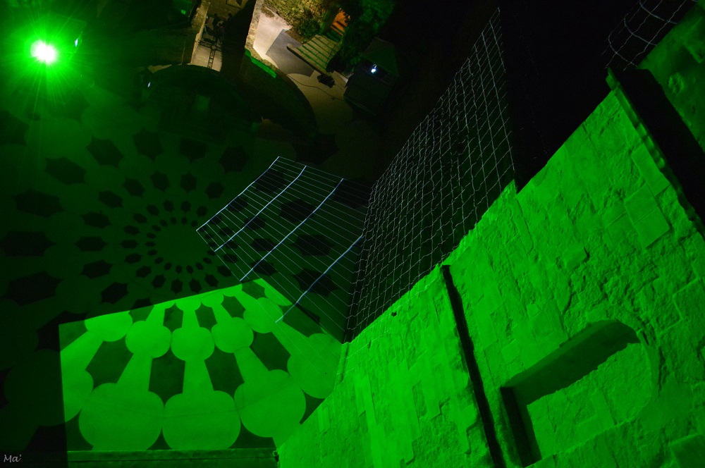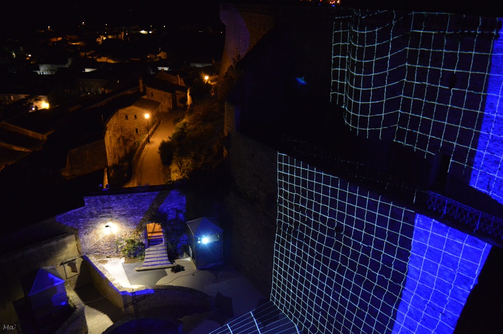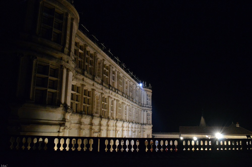 Après avoir longuement applaudi, nous retournons sur les terrasses jeter un dernier coup d’œil à la majestueuse façade Renaissance du château… et découvrir d’étranges colorations sur le parvis de la collégiale tandis que les calages des futures projections monumentales sont en cours.
