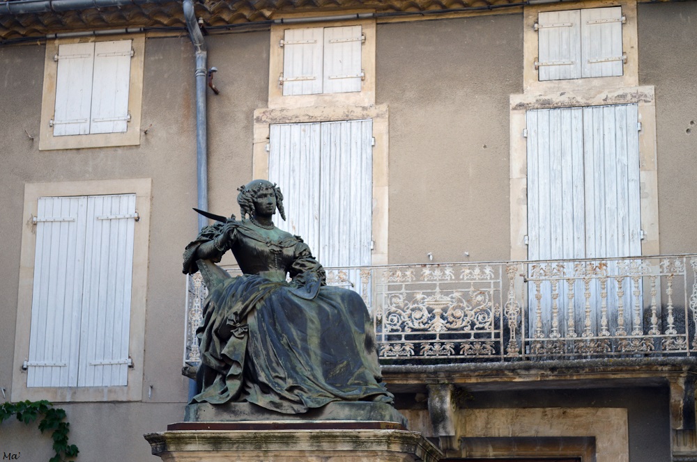 Après avoir laissé la voiture sur l’un des grands parkings (en herbe) aux abords du centre, nous remontons la rue (piétonnisée) vers le cœur du village. Nous repérons de charmantes façades, et arrivons rapidement à la place où une statue de Madame de Sévigné, décédée et inhumée à Grignan, a été installée au XIXe siècle.