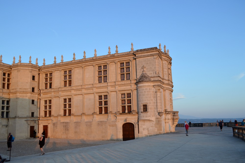Connaissant déjà le village de Grignan, nous profitons de la terrasse abritée du vent du café des Vignerons pour déguster un verre de vin de l’appellation Grignan-les-Adhémar(et faisons également quelques emplettes). Puis, nous prenons la direction du château pour notre soirée.