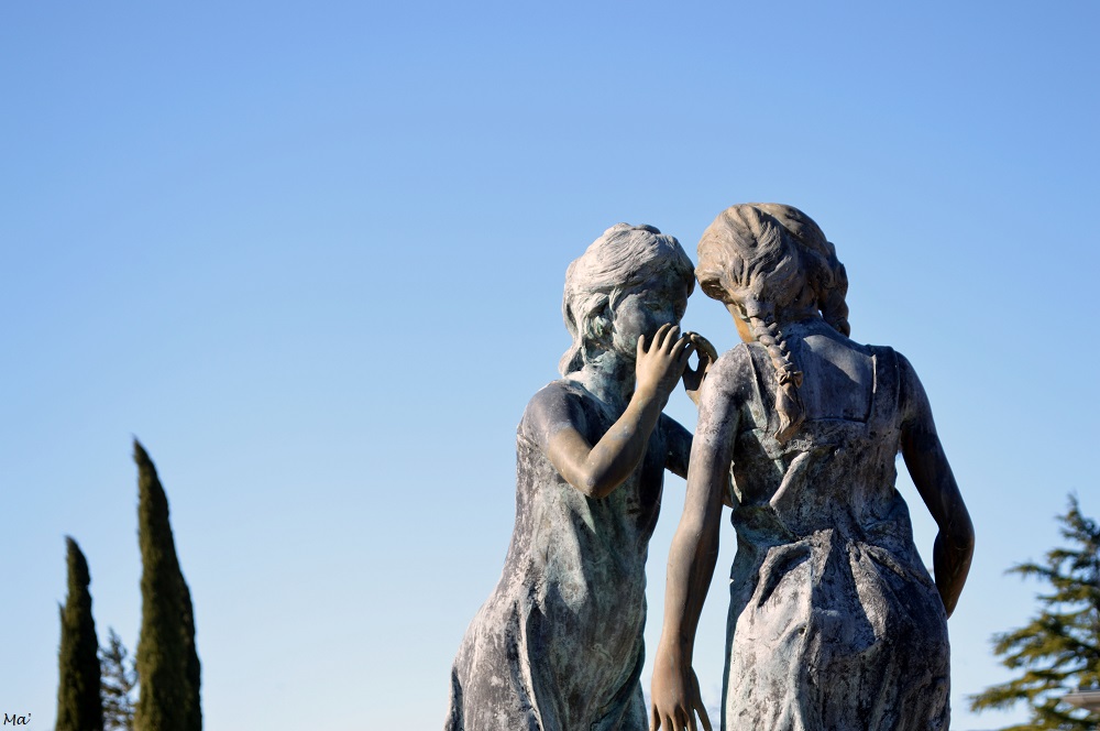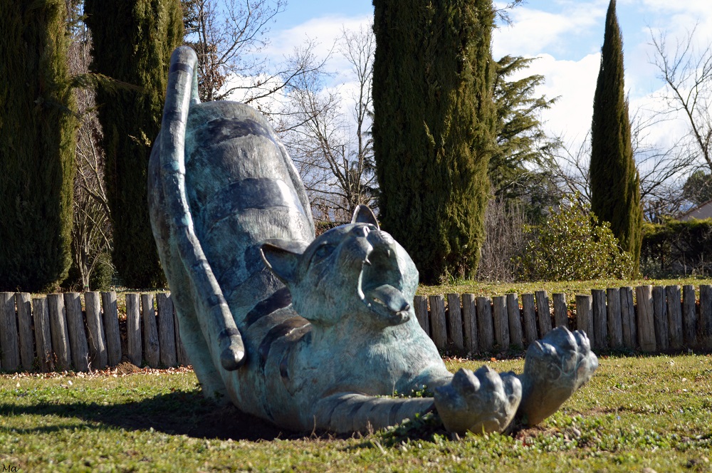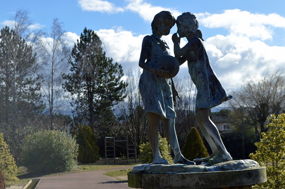 A l’occasion d’une course à faire à Montélier, j’ai fait un crochet par le Jardin Sémaphore où je n’étais pas allée depuis très longtemps. Il présente surtout l’intérêt d’être un bel espace de jeux pour les enfants, avec un petit canal au milieu et deux belles sculptures : un chat s’étirant, et deux fillettes se chuchotant des secrets. Toutefois, je préfère largement la poésie du Jardin des Rêves.