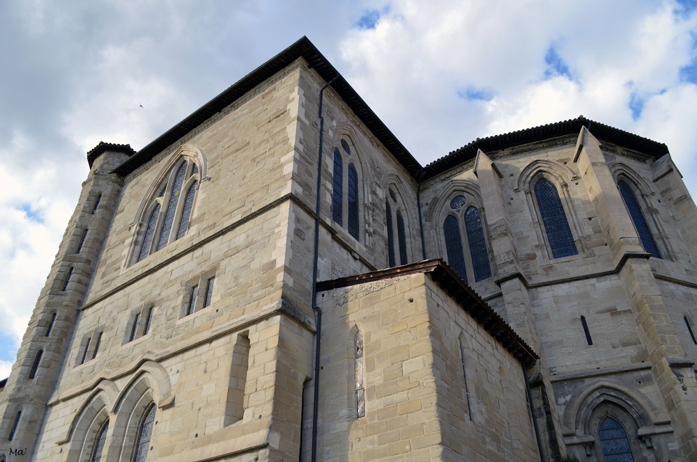 Nous avons un temps longé la rivière avant de remonter en ville pour découvrir l’imposante cathédrale Saint Etienne qui se détachait sur le ciel à l’heure bleue. Une porte était ouverte, et une lueur s’en échappait. Alors, nous nous sommes glissées à l’intérieur pour une discrète incursion dans la nef. Une messe était en cours dans une des chapelles derrière le chœur ; nous ne sommes donc pas allées plus loin. Mais cette petite visite semi-nocturne a ajouté une petite touche d’extraordinaire et de magie complémentaire à notre balade.