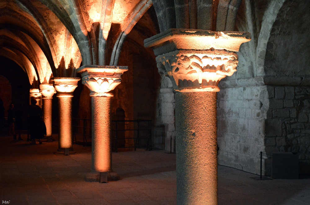 Alors que le jour commence à décliner, nous entrons dans l’église. C’est l’obscurité qui nous surprend en premier. Même en plein jour, l’intérieur, faiblement éclairé par quelques rares petites fenêtres, reste sombre, alors sans la lumière du jour, c’est le noir total dans la nef. La guide, munie d’une lampe torche, nous explique l’histoire de l’édifice tout en montrant les détails intéressants de son architecture. Située sur une route vers Saint Jacques de Compostelle, l’abbaye de Cruas était un lieu de passage pour les pèlerins qui s’y arrêtent pour prier sur les reliques de deux saints . Ceux-ci descendaient dans la nef de l’église par un escalier monumental, tandis que les moines restaient en haut de la tribune monastique pour assister aux offices.