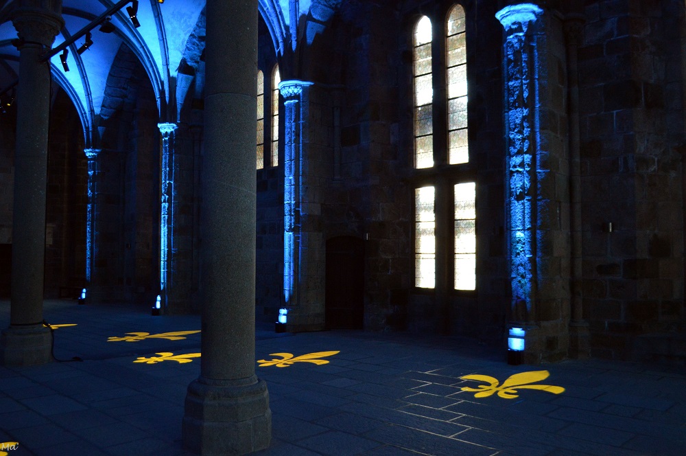 Dans l’abbaye, équipés d’un audioguide dernière génération (les audios se déclenchent automatiquement lorsque nous pénétrons dans une pièce via un système de boucle bluetooth), nous commençons notre découverte par la salle des Gros Piliers. Nous irons ensuite de pièce en pièce, passant par des escaliers plus ou moins dérobés, jusqu’à terminer sur la plateforme devant l’abbatiale à l’heure du coucher du soleil.