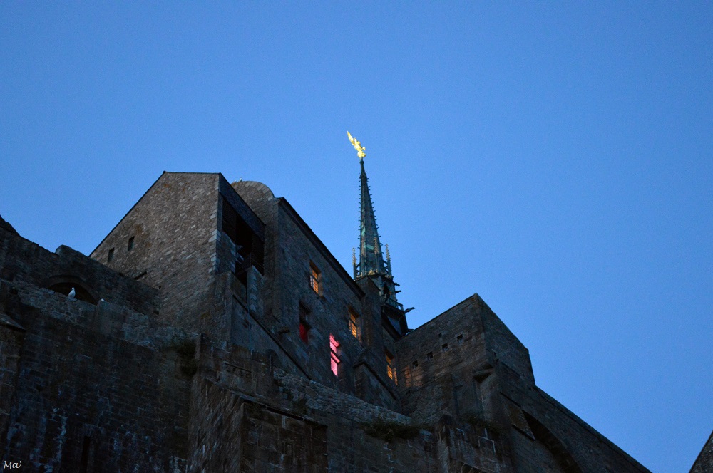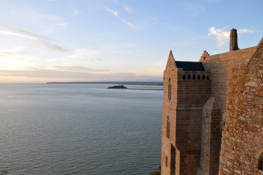 En arrivant sur la terrasse qui s’ouvre devant l’église, nous avons eu la belle surprise de constater que la marée était presque haute. La mer venait chatouiller doucement les pieds du Mont Saint Michel, tandis que le soleil déclinait. Nous avons pris le temps d’attendre que le soleil se couche sur l’horizon depuis ce belvédère somptueux sur l’ensemble de la Baie.