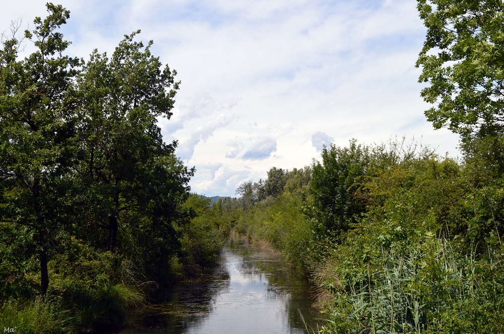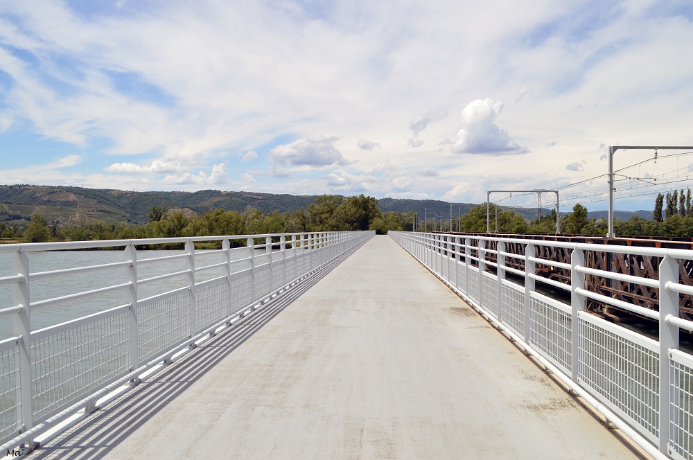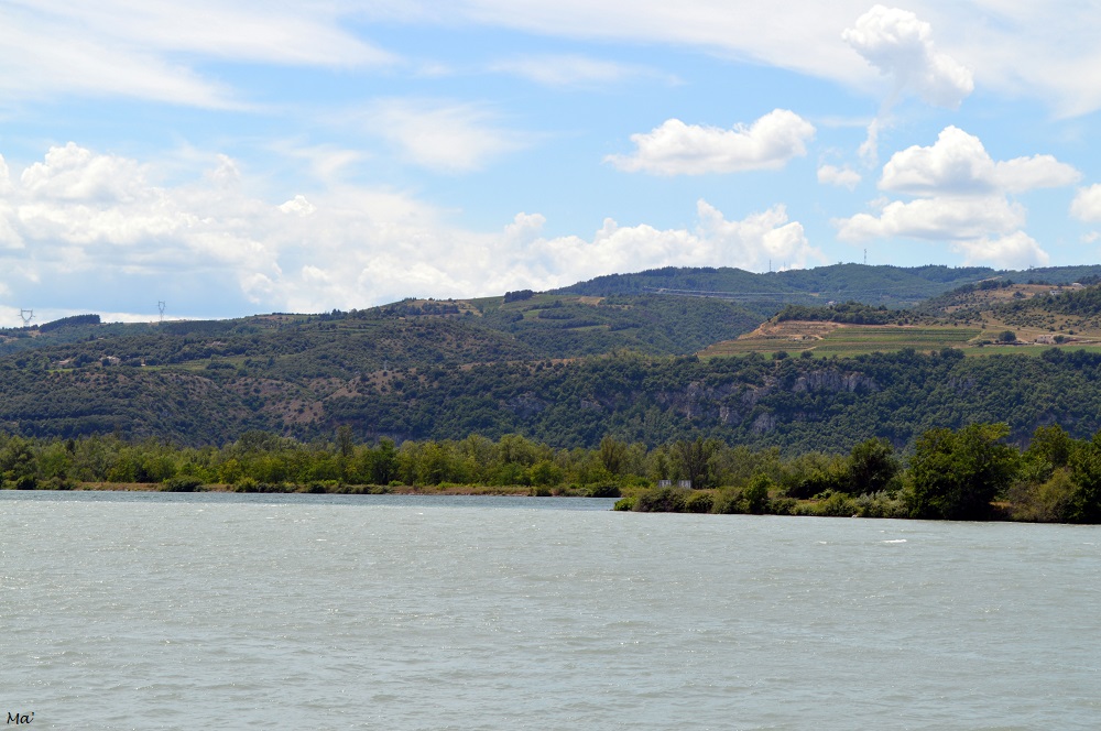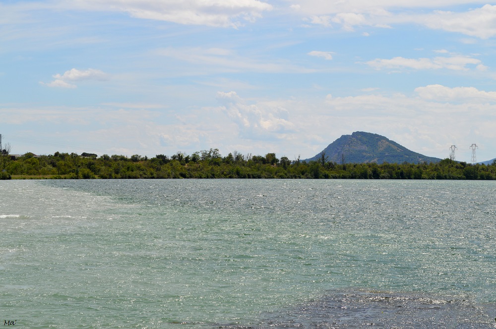 Avec Melle 3e, nous sommes donc parties après ma journée de travail. La météo (froid, pluie et vent) des jours précédents nous avait fait craindre de ne pas pouvoir pique-niquer, mais nous avons bénéficié de la seule journée vraiment printanière de la quinzaine. Nous avons donc emporté de quoi diner dehors. A Cruas, nous avons pris la direction du bord du Rhône, cherchant un petit coin de nature pour nous installer. Nous avons trouvé de la place au bord d’un lac de pêche, profitant même d’une table de pique-nique. Avant de partir en direction du centre du village, nous avons fait un tour sur la digue du Rhône, apercevant La Coucourde de l’autre côté du fleuve (nous avons plus l’habitude d’apercevoir Cruas depuis La Coucourde que nous traversons sur la N7 quand nous allons à Montélimar).