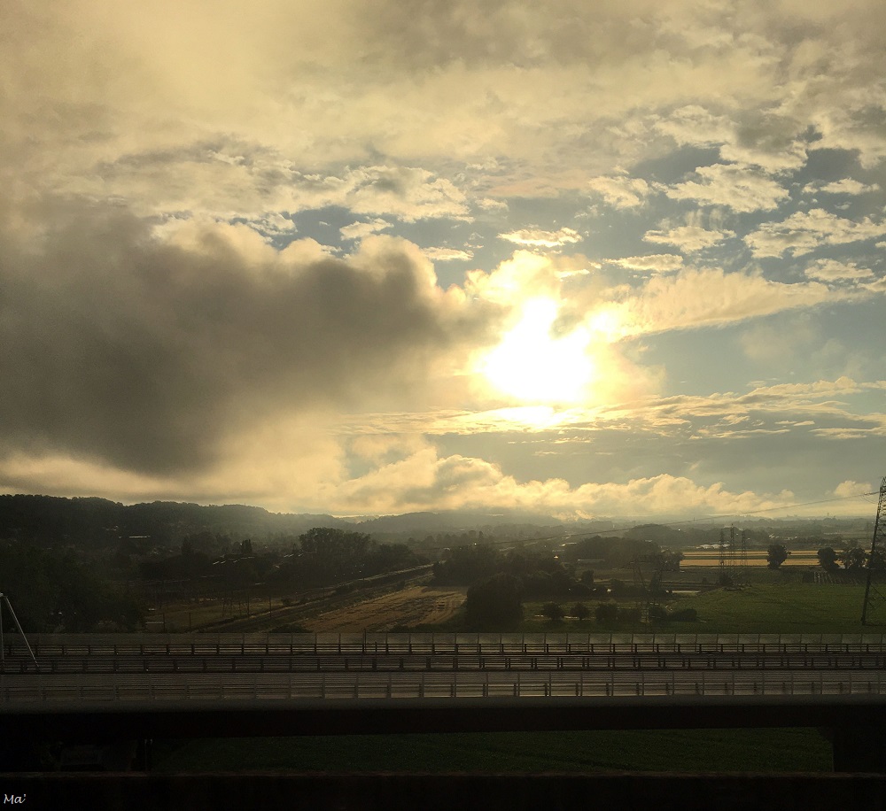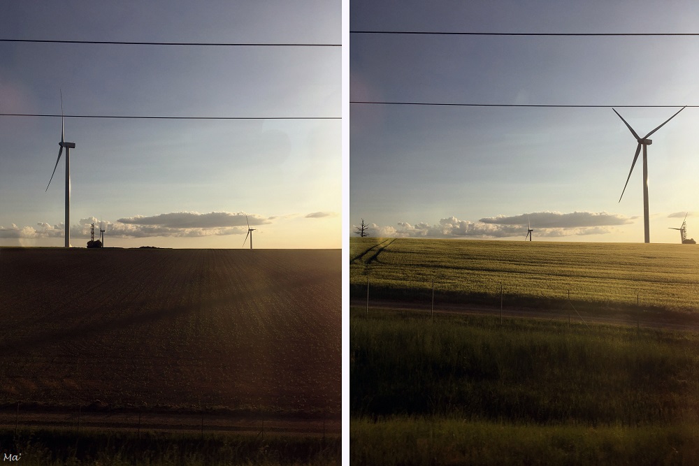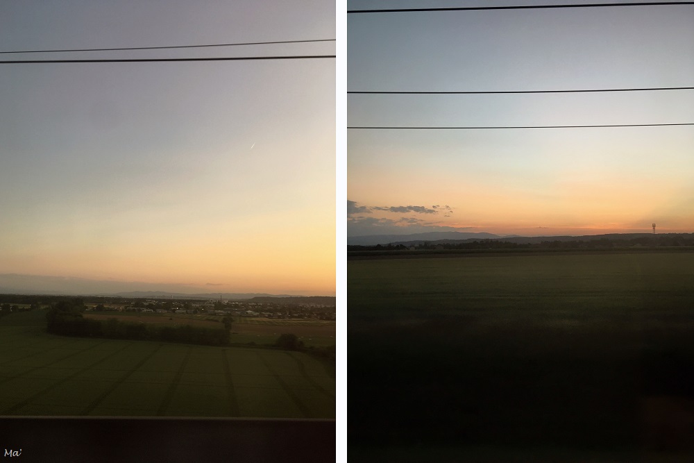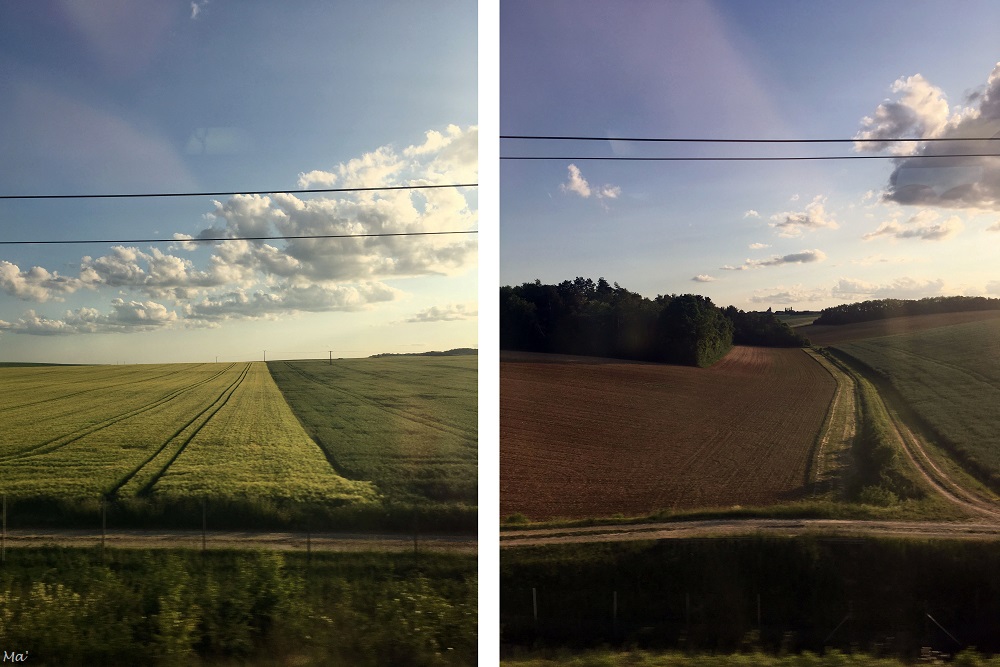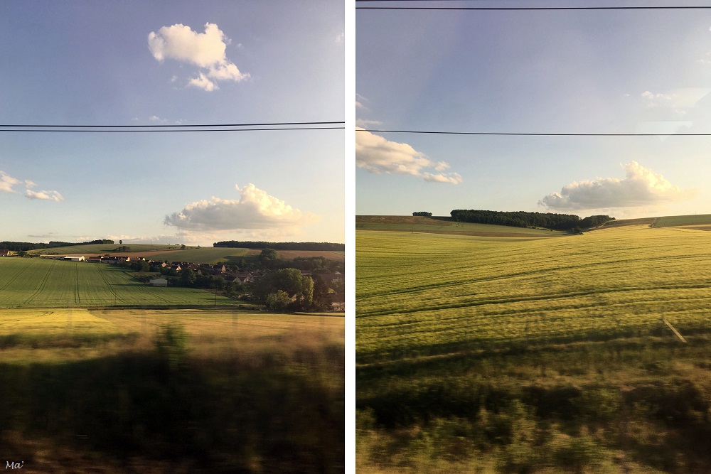 J’ai eu de nouveau l’occasion de me rendre à Paris dans le cadre d’un déplacement professionnel courant mai. Partie le matin, je suis rentrée par un train en toute fin de journée, à l’heure où le soleil décline et se couche. Le hasard m’a placée du bon côté de la rame pour profiter des dernières lumières du jour sur la campagne entre Bourgogne et Rhône-Alpes. Le spectacle était superbe et je n’ai pas pu m’empêcher de le photographier (avec mon téléphone… je n’emporte pas mon gros APN lorsque je pars pour une journée de réunions, et de façon générale quand je vais en déplacement professionnel où j’ai déjà pas mal de choses à transporter !)