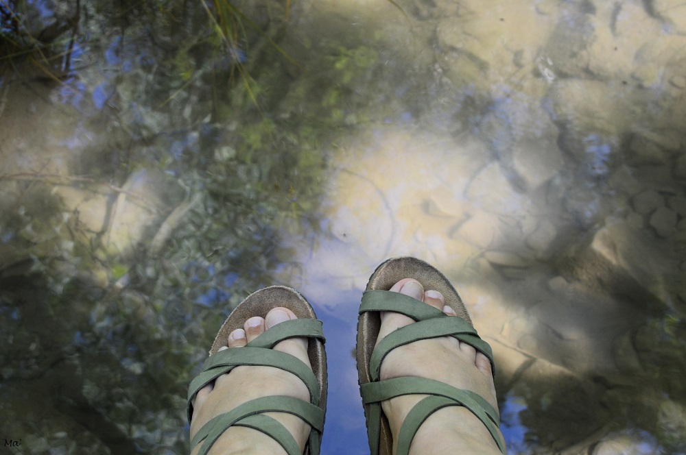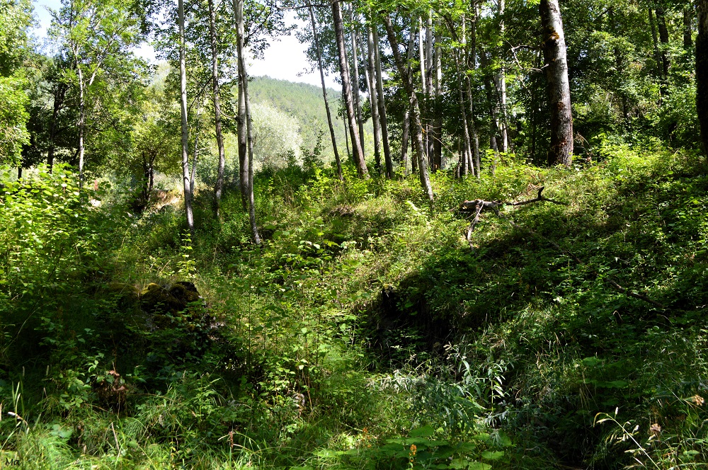 Nous avons suivi l’eau qui nous a guidés vers des cheminements de bois et des panneaux d’interprétation permettant de découvrir le vallon, ses sources, sa biodiversité et son histoire. On aperçoit en effet les fondations de maisons, installées dans le vallon, et qui ont été emportées le 3 janvier 1936 par un glissement de terrain. Seules les habitations du haut du village, construites sur le flanc de la montagne calcaire avaient alors été épargnées. La petite balade est agréable. J’ai même regretté de ne pas avoir emporté de livre car je serais bien restée plus longtemps assise dans la fraicheur du vallon alors qu’ailleurs le mercure jouait avec les 40°C.
