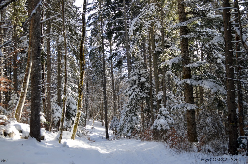 Très vite, le chemin s’enfonce dans la forêt. Il y a peu de randonneurs ce matin-là et je me retrouve très vite seule sur mon itinéraire. Autour de moi, les arbres majestueux sont recouverts de neige. L’ambiance est féérique. Le silence est seulement troublé de temps à autre par le bruit de la neige qui dégringole des branches secouées par un petit coup de vent.