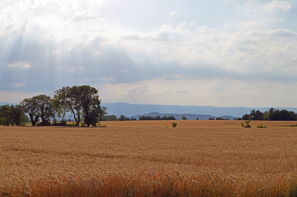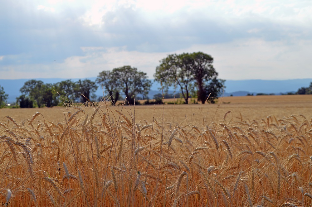 Chaque année, j’ai l’impression que les moissons débutent plus tôt que l’année précédente. Cette année, fin juin début juillet, les moissonneuses batteuses tournaient à plein régime. J’avais cependant eu le temps de prendre rapidement en photo les céréales dorées, tôt un matin. Je n’ai pas eu d’autre occasion cette année. Mais j’aime beaucoup la couleur que prennent les champs prêts pour la récolte.