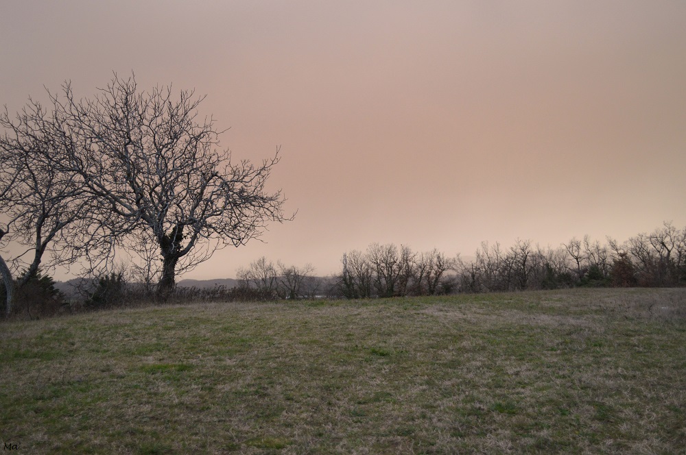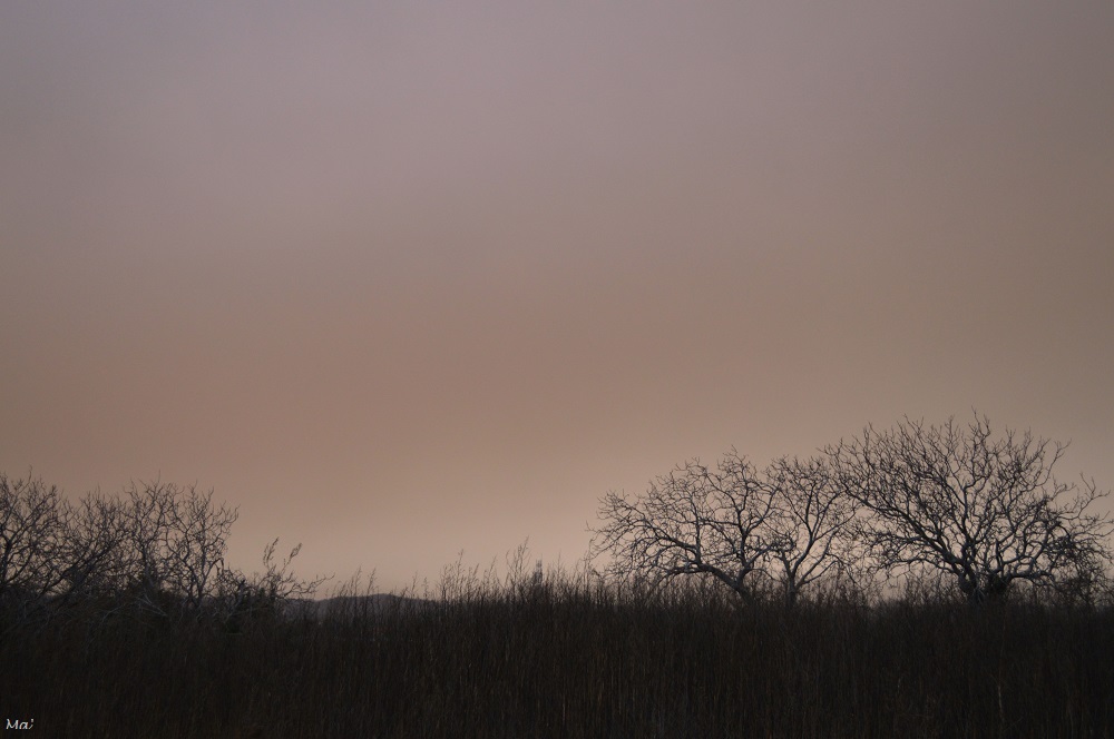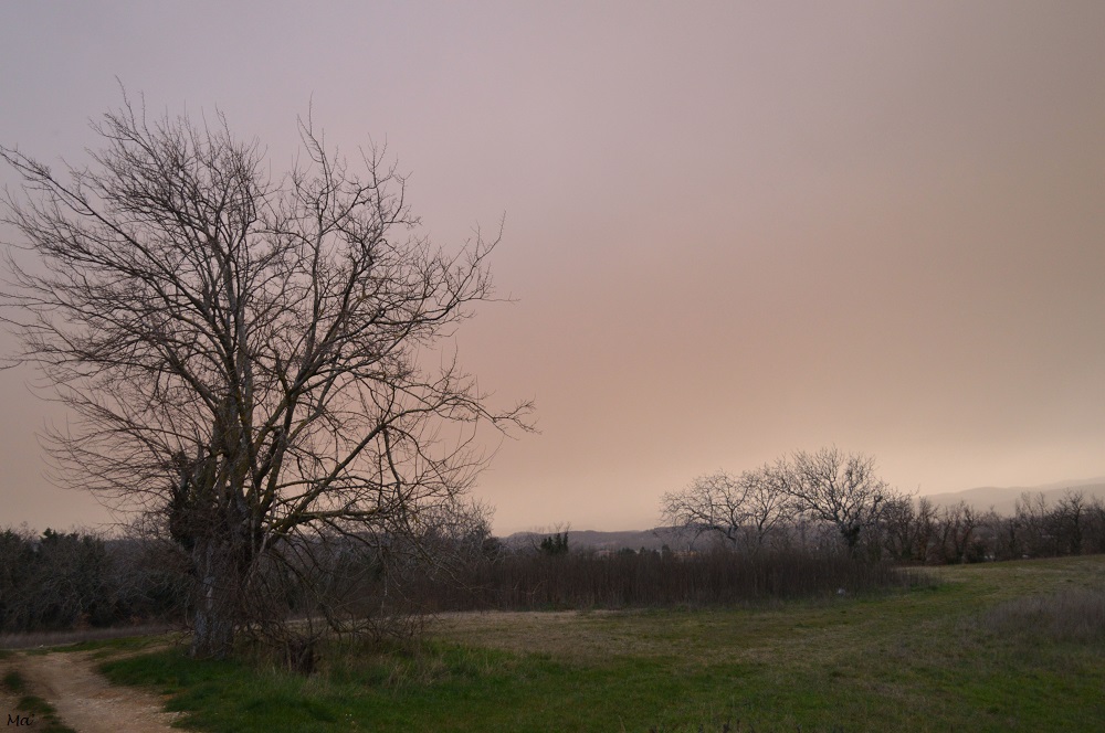 Samedi dernier, toute la journée a été teintée d’une couleur orangée, un peu sépia due à un vent de sirocco. Ce vent portait des particules de sables sahariens, causant cet effet visuel très impressionnant.