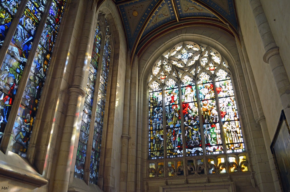 Nous avons un temps longé la rivière avant de remonter en ville pour découvrir l’imposante cathédrale Saint Etienne qui se détachait sur le ciel à l’heure bleue. Une porte était ouverte, et une lueur s’en échappait. Alors, nous nous sommes glissées à l’intérieur pour une discrète incursion dans la nef. Une messe était en cours dans une des chapelles derrière le chœur ; nous ne sommes donc pas allées plus loin. Mais cette petite visite semi-nocturne a ajouté une petite touche d’extraordinaire et de magie complémentaire à notre balade.