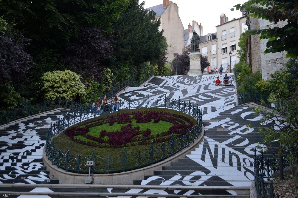 Après la visite du château et une pause à l’hôtel pour reprendre des forces (et se rafraichir avec une douche… la canicule était bien présente ce jour-là !), nous sommes retournées dans le centre de Blois pour diner. Nous en avons profité pour une jolie balade dans les rues de la ville alors que le jour déclinait. Nous avons arpenté les ruelles et escaliers bordés de maisons à pans de bois et de façades en pierre claire. Nous avons pu profiter de l’ouverture tardive de la cathédrale pour en faire le tour alors que le soleil venait nimber les parties hautes de celle-ci d’une lumière dorée. Nous avons marché sans nous soucier d’un itinéraire, nous laissant porter par ce que nous apercevions des rues suivantes lorsque nous arrivions à une intersection. Nos pas ont fini par nous mener au pied de l’escalier Denis Papin, habillé d’un hommage au mouvement Fluxus (mouvement artistique au coeur du projet de la Fondation du Doute de l’artiste Ben qui se trouve à Blois.. et que nous n’avons pas eu le temps de visiter). 120 marches plus haut, nous dominons la grande perspective qui file au delà de la Loire au cœur de la forêt de Sologne sur laquelle la journée se termine…..