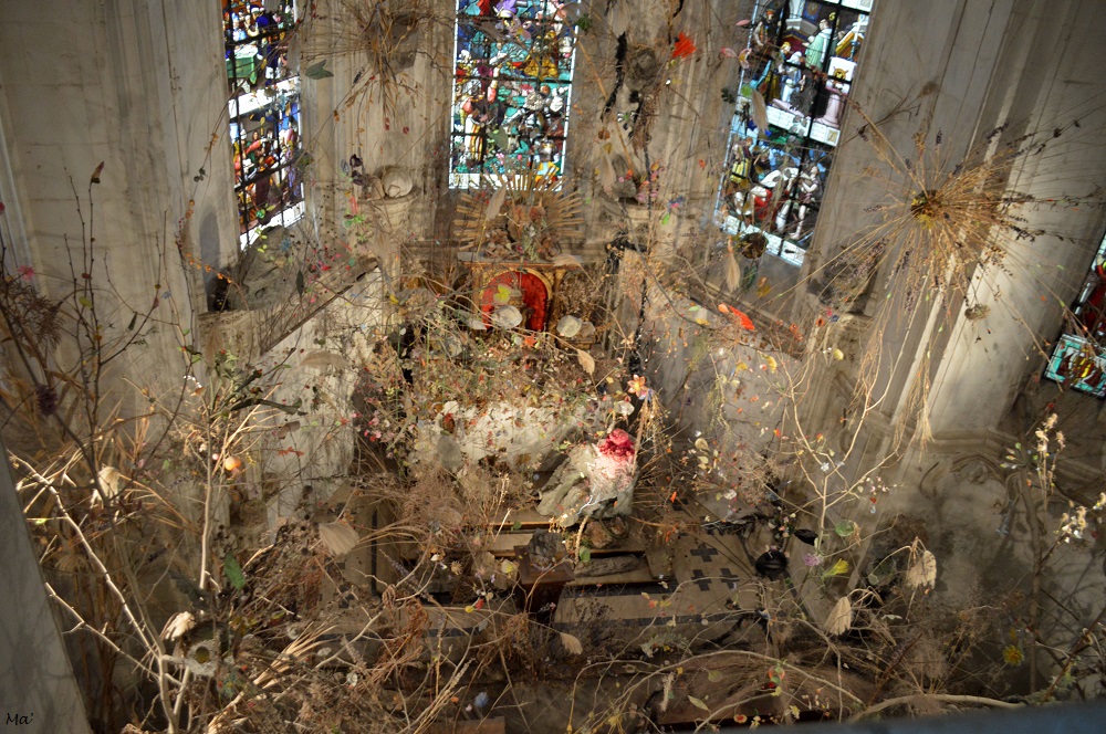 Le domaine de Chaumont est également un centre d’art contemporain. Un peu partout dans le domaine, du château aux écuries, on découvre des œuvres ou des installations monumentales, parfois éphémères, parfois pérennes. Depuis 2020, le couple d’artistes suisses Gerda Steiner et Jörg Lenzlinger a ainsi investi la chapelle. Une de leurs œuvres est exposée dans l’entrée du musée de Valence et ils avaient mis en place la première exposition « all-over » dans le même musée en 2019. Lorsque j’ai aperçu leur installation dans la chapelle du château de Chaumont, j’ai immédiatement reconnu leur style foisonnant si original, mêlant naturel et artificiel.