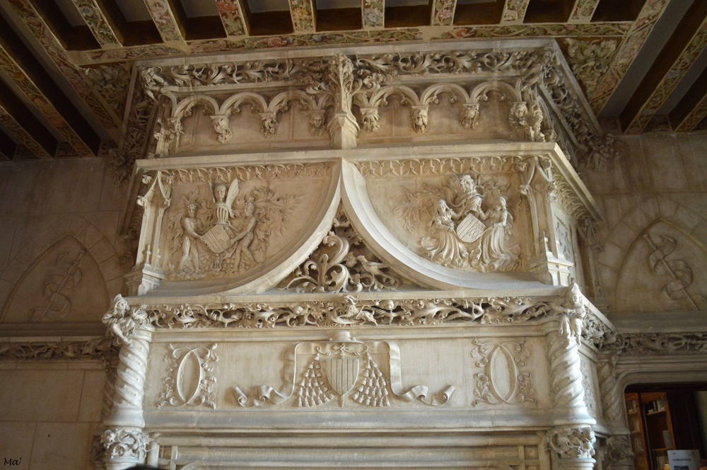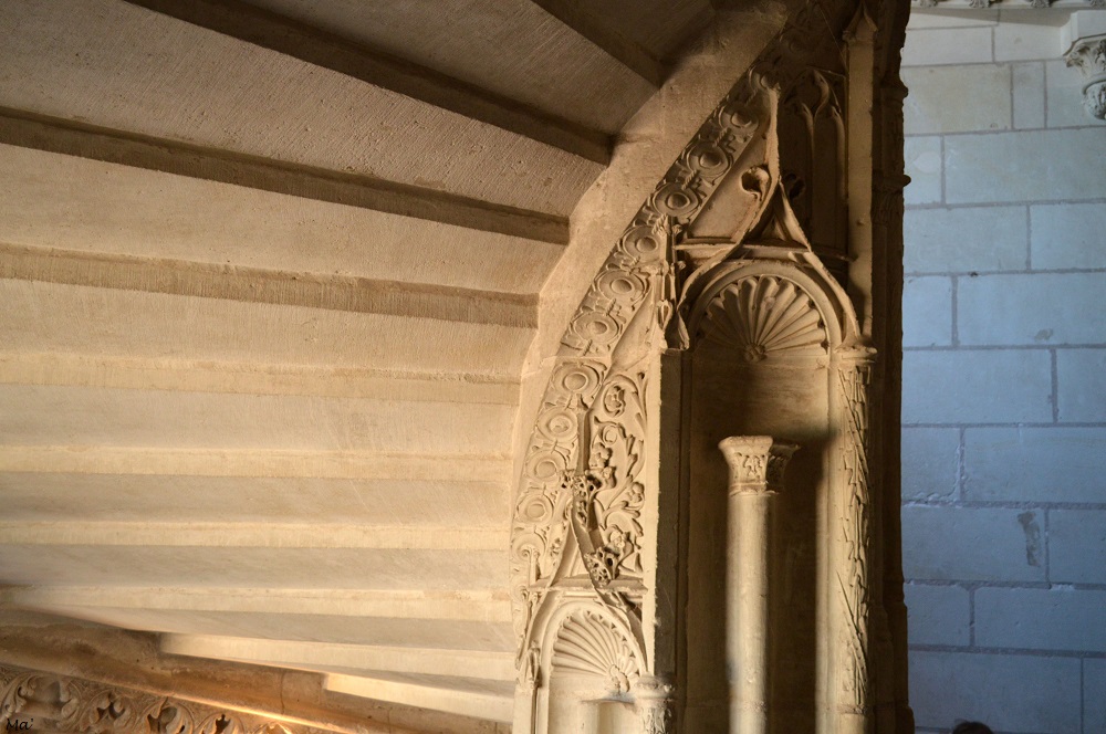 Sur la cheminée, la salamandre de François Ier côtoie l’hermine de Claude de France, son épouse et fille de Louis XII et d’Anne de BretagneDans la galerie du musée des Beaux-ArtsLes vitraux de la chapelle Saint Calais, réalisés par Max Ingrand, ont été posés en 1957 L’escalier d’honneur de l’aile Gaston d’OrléansQuand le soleil de fin d’après-midi éclaire l’aile Louis XIISur la façade extérieure, une statue équestre de Louis XII au-dessus de son emblème, le porc-épic, de son chiffre et de celui de son épouse Anne de Bretagne
