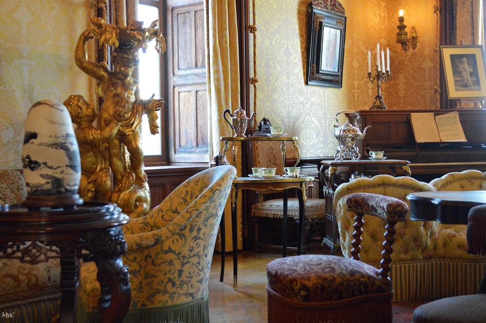 La chambre dite de RuggieriSculptures délicates dans l’escalier d’honneurDans la salle à manger…La cheminée de la salle à mangerLe grand salon et son mobilier Napoléon III