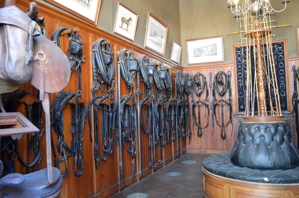 Après le château, nous nous sommes dirigées vers les écuries. Les bâtiments sont un véritable témoin d’une époque où progressivement les voitures à cheval ont laissé la place aux voitures automobiles, mais aussi du luxe qui entourait les soins des chevaux d’apparat. La sellerie en particulier regroupe l’ensemble des harnachements des chevaux tant pour l’attelage que pour la monte, et semble figée dans le temps. Tout comme le château, les écuries servent maintenant d’écrin pour l’art contemporain et depuis 2028, en plein midi, une œuvre immense de Klaus Pinter emplit l’espace de maréchalerie, tandis que certaines écuries accueillent des installations plus éphémères.