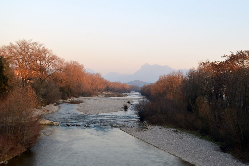 En sortant de l’exposition où nous étions allées en fin d’après-midi, nous avons fait un tour dans les rues de Crest où nous étions pile à l’heure pour admirer la lumière de l’heure dorée sur la tour de Crest et sur la rivière Drôme.