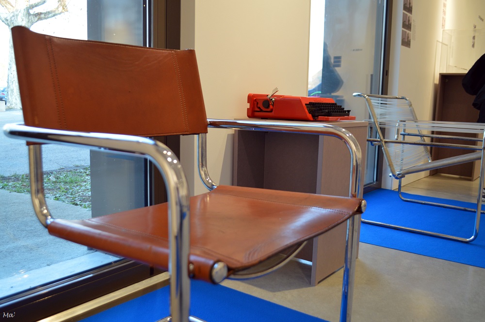 Au delà des petits objets, il y a également le mobilier. Entre la chaise longue de Charlotte Pierrand et le fauteuil Poang d’Ikea, on peut voir des chaises de Philolaos (déjà aperçues au Musée de Valence lors de l’exposition de 2020 consacrée à l’artiste), la chaise B34 et le fauteil B3 Wassily de Marcel Breuer, la table et les chaises Tulip éditées par Knoll…