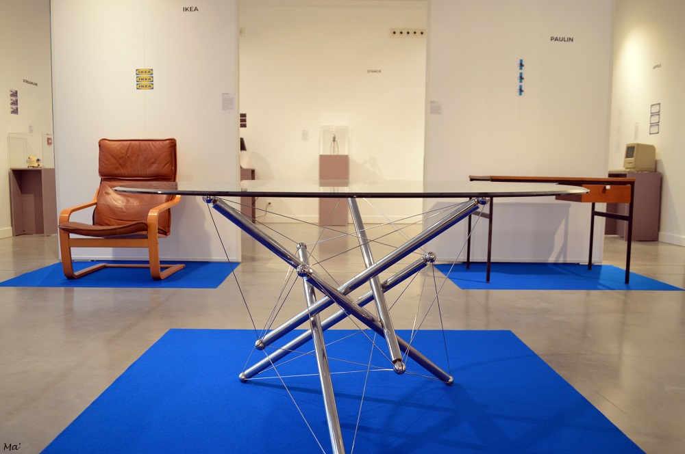 Au premier plan, chaise de Philolaos / en arrière-plan, chaise longue de Charlotte PierrandAmbiance sixties avec la table et les chaises Tulip d’Eero Saarinen pour KnollChaise B34 (1933) et fauteuil B3 Wassily (1926) de Marcel BreuerAu premier plan, la table de Theodore Waddell éditée par Cassina utilise une technique de câbles en tension pour déporter la portance entre le sol et le plateau… Mon vrai coup de cœur dans cette exposition. En arrière-plan, le fauteuil Poem d’Ikea, grand frère du fauteuil Poang actuel, et un bureau de Xavier Paulin.
