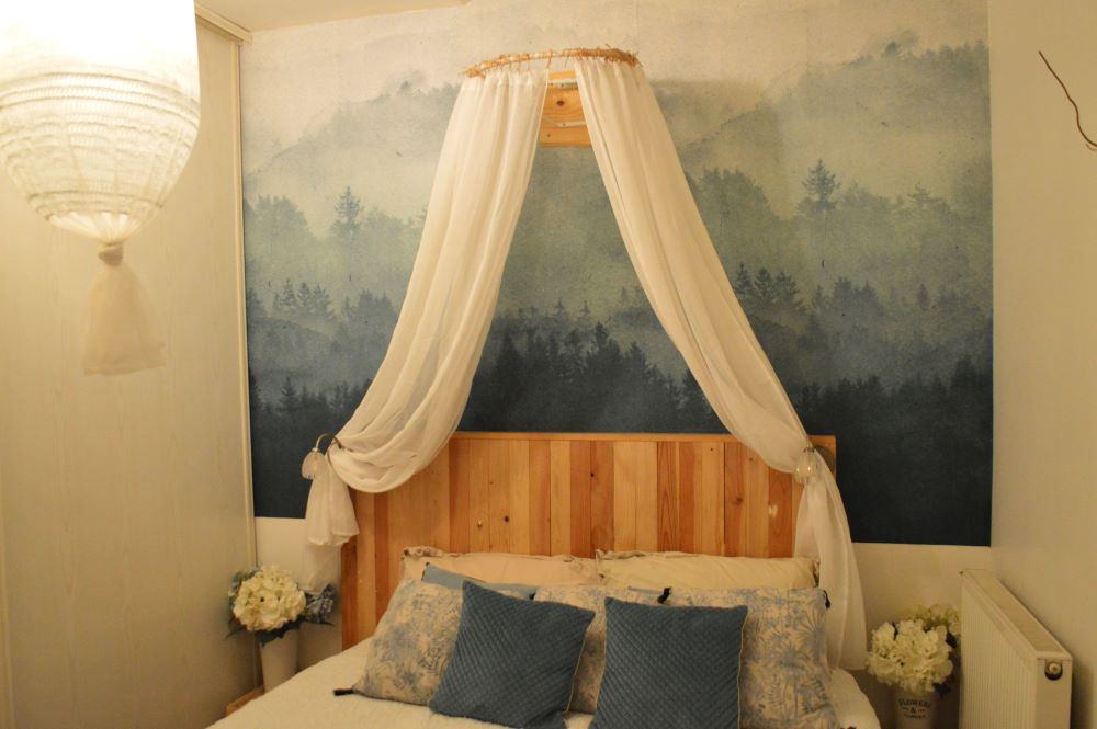 Pour le repas, l’office de tourisme des Monts du Lyonnais avait fait pour nous des courses dans un magasin de producteurs. Nous avons donc diné d’une soupe, de charcuteries et de fromages locaux, dans une ambiance conviviale. Après le repas, nous avons sorti une petite enceinte à karaoké qui était disponible sur place, avons approché les fauteuils du poêle et passé une excellente soirée. Il y a également de nombreux jeux de société et plein de livres à disposition. Nous avons hyper bien dormi car la literie était vraiment confortable et en ayant bien chargé le poêle avant de partir nous coucher, nous avons conservé une bonne température dans toutes les pièces. J’ai été réveillée avec le jour et j’ai pu découvrir par la fenêtre l’environnement absolument magnifique.