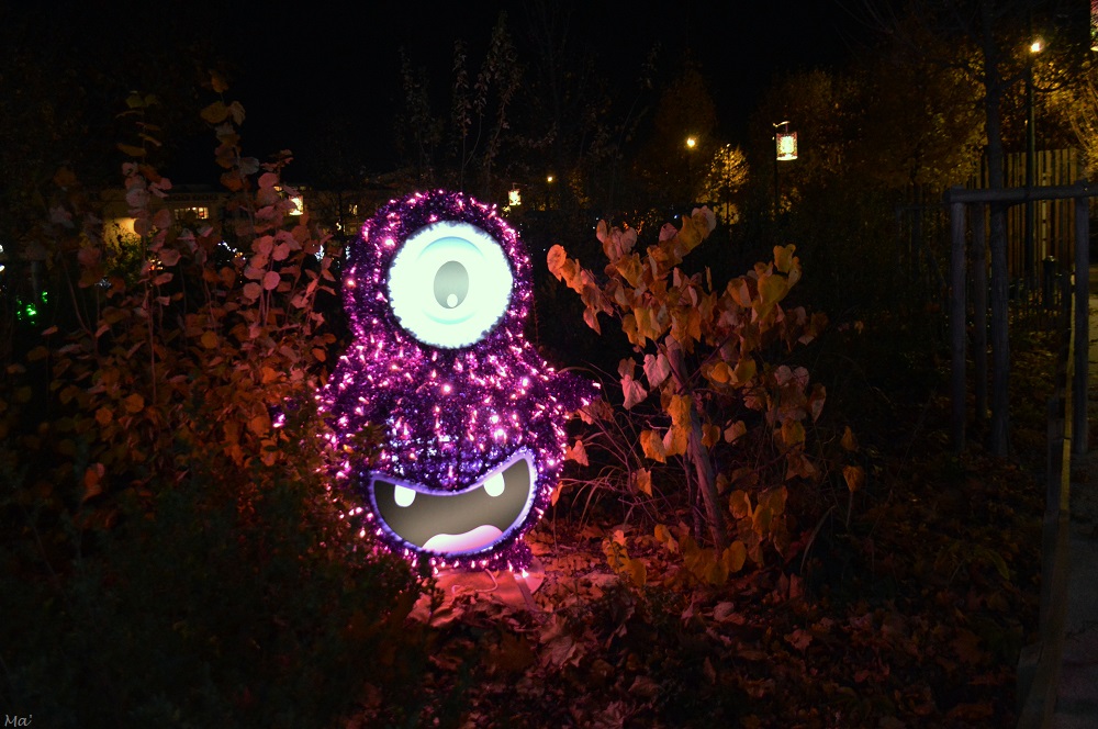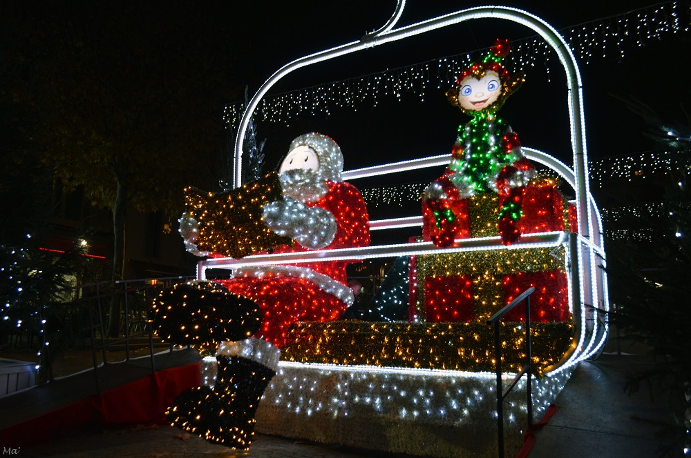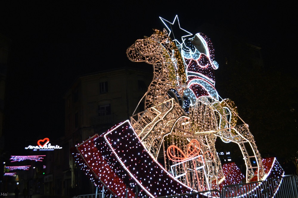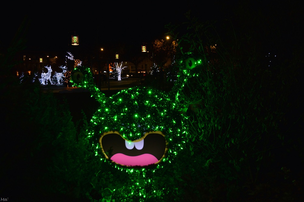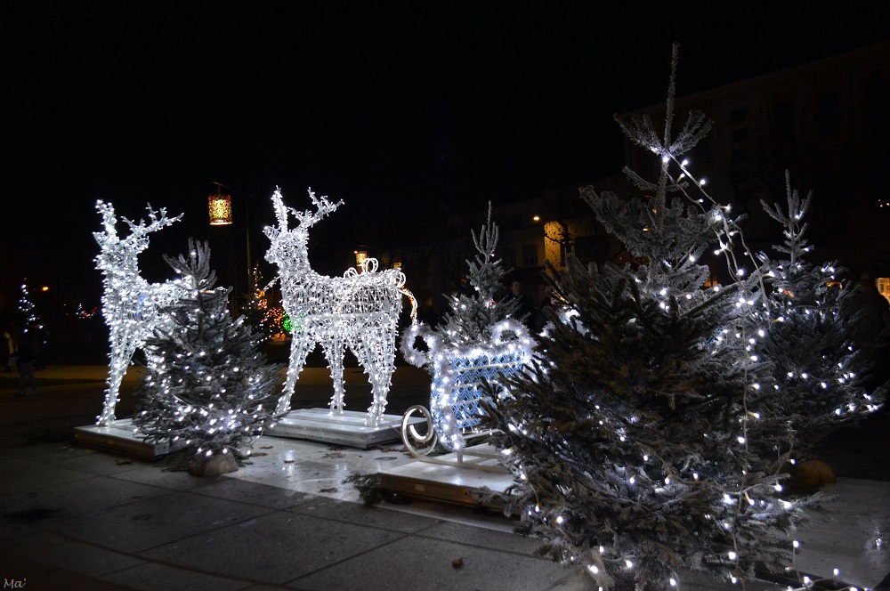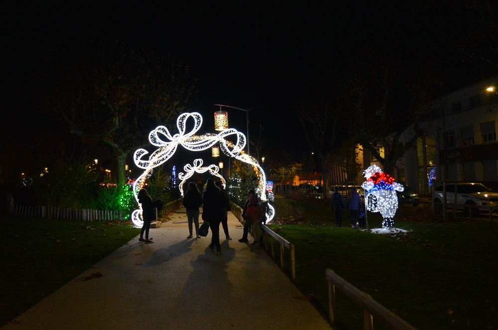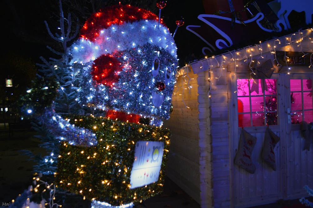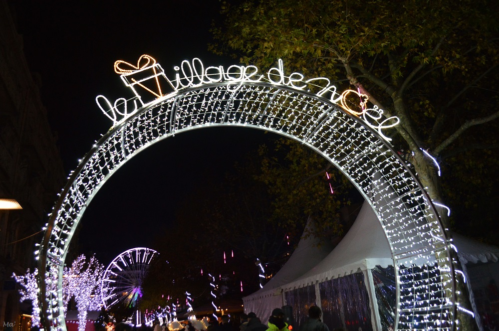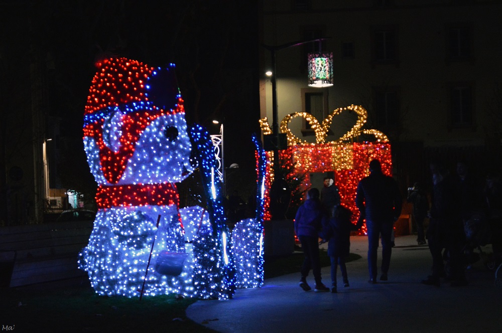 Comme chaque année, la ville de Valence a installé de nombreuses structures lumineuses à différents endroits clés. Sur les boulevards, un gros nounours accueille les visiteurs, tandis qu’un écureuil devant la mairie fait la joie des enfants. Sur la place Porte Neuve, le sapin géant a fait peau neuve. Fini la structure verte des années précédentes et place à une installation plus aérienne toute en doré. Mais, la majeure partie des structures se trouve aux alentours du Champ de Mars. Là, une allée de feuilles lumineuses géantes guide le promeneur depuis la structure Mon Cœur Valence jusqu’au kiosque Peynet. Une nouvelle fois, des lampadaires géants entourent ce point de repère incontournable du paysage valentinois. Lui faisant face au bout de l’avenue, la gare a aussi revêtu ses lumières de fêtes. Mais, mon installation préférée reste les fleurs géantes de la place Aristide Briand, que les variations de couleurs et les mouvements du vent rendent si poétiques. Enfin, autour de la fontaine monumentale, le long des boulevards, on retrouve comme chaque année le village de Noël avec ses chalets, ses animations, et la grande roue.