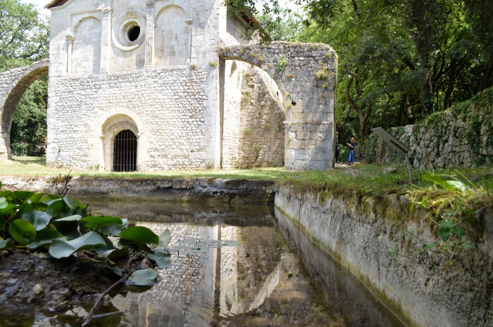 La chapelle du Val des Nymphes, toute en simplicitéReflet de la chapelle dans le bassin aux eaux claires, alimenté par la source du siteLa simplicité de la chapelle romane du Val des Nymphes