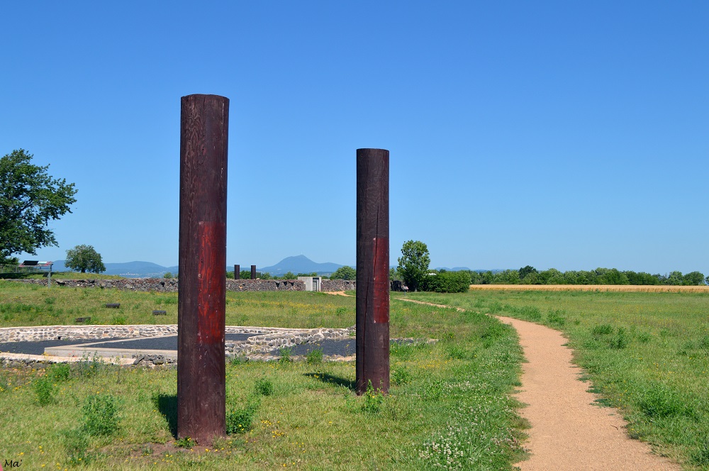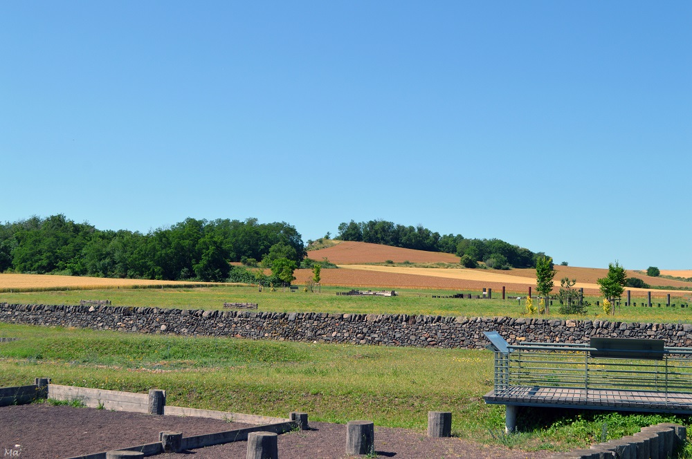 Après avoir visité les petites cités de caractère du territoire de Mond’Arverne, j’ai pris la direction du site archéologique du plateau de Corent. Tout comme à Gergovie, il y avait à Corent un oppidum gaulois. Il semblerait même que Corent a été la première capitale des Arvernes, avant Gergovie. En effet, des fouilles récentes (essentiellement depuis 2001) ont montré une occupation du site depuis le néolithique et il constitue une des plus vastes agglomérations connues de l’âge du bronze en Europe. De nombreuses découvertes (sanctuaire, habitat, bâtiments publics, ..) ont été faites sur le site archéologique de Corent permettant de mieux comprendre l’organisation et la civilisation gauloises. Sur place, de nombreux panneaux d’interprétation jalonnent un sentier qui permet de faire le tour du site et d’en apprendre plus sur les vestiges découverts ici et leur interprétation.