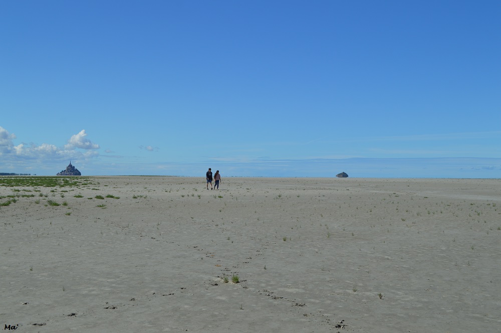 Notre but se profile au loin : approcher le chenal de la Sée-Sélune qui ce jour-là est au plus proche de la rive opposée (le lit des rivières se déplace dans la baie… en fonction des vents et des marées : on ne sait jamais avec certitude où il se trouvera).
