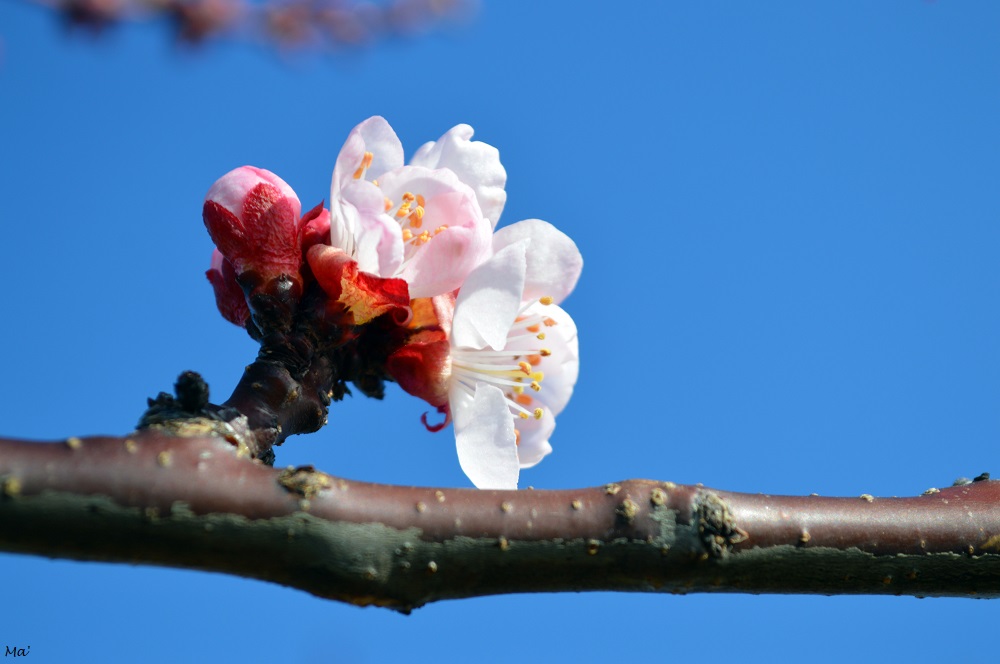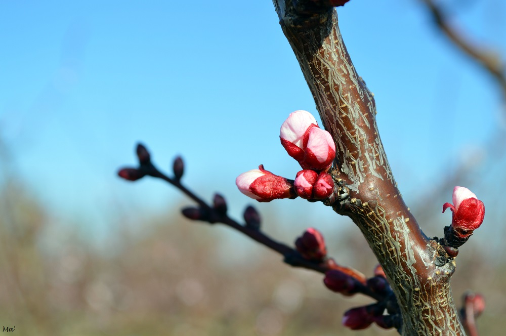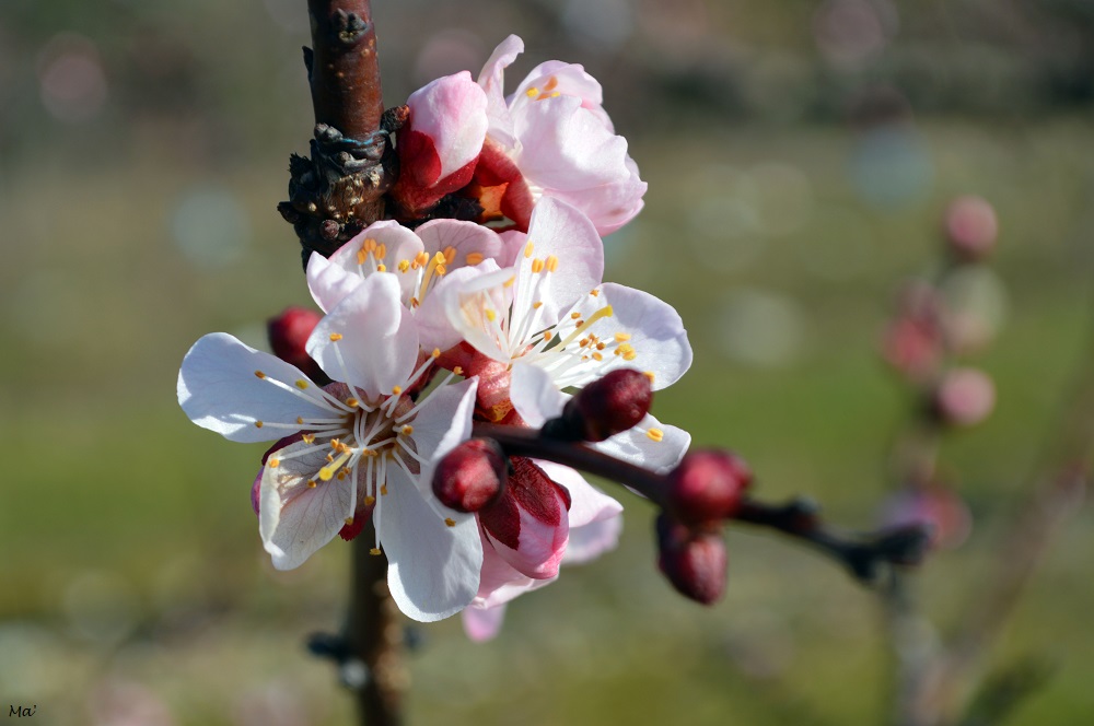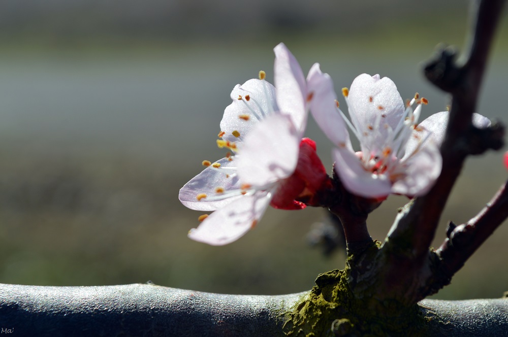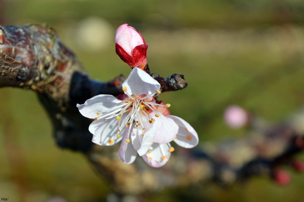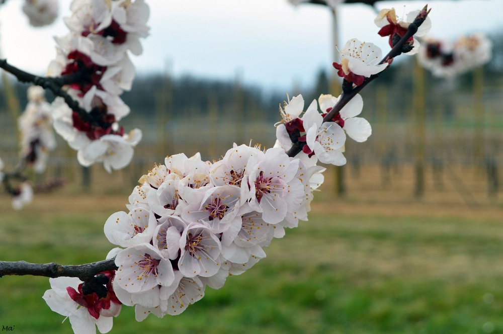 Cette année, j’ai pu m’arrêter prendre quelques photos alors que la floraison venait tout juste de débuter dans un champ d’une variété précoce d’abricots. (Malheureusement un épisode de gel nocturne est survenu quelques jours après, faisant des dégâts importants sur les fleurs fragiles…)