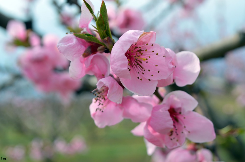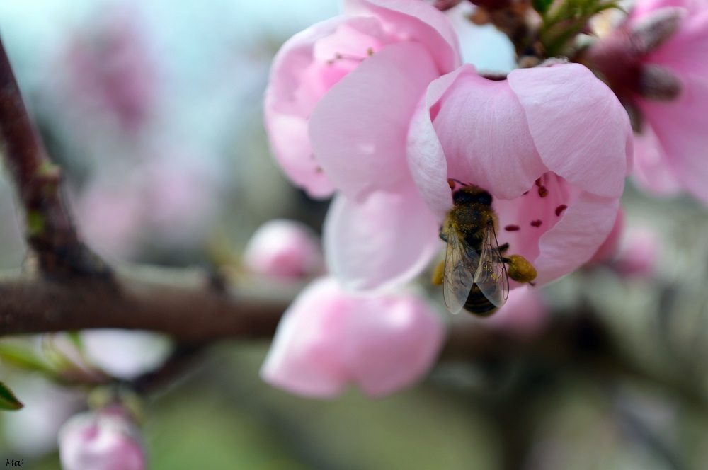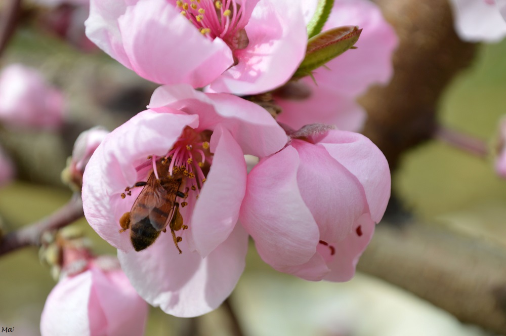 J’y suis retournée deux semaines plus tard. La floraison était alors nettement plus avancée. Ainsi les champs de pêchers étaient parés du rose de leurs fleurs, parmi lesquelles de petites feuilles vertes commençaient à faire leur apparition. Toutes ces fleurs ne manquaient d’ailleurs pas d’attirer les abeilles qui se trouvaient fort affairées à butiner. La récolte du pollen semblait d’ailleurs fructueuse si l’on en croit les gros paquets jaunes qui venaient alourdir leurs pattes !