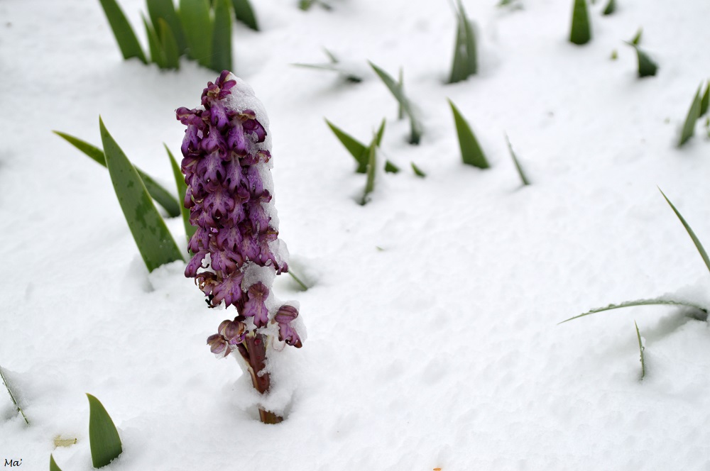La neige qui est tombée tout début avril a conduit à un télescopage entre printemps et hiver. En me promenant sur les hauteurs de Montvendre, je n’ai pu que remarquer quelques orchis géants pris dans la neige….