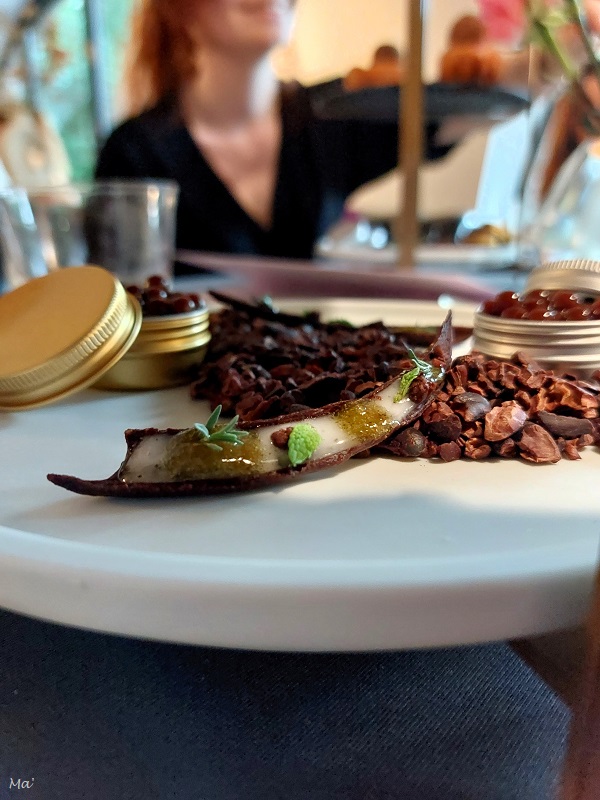 Nous nous sommes donc retrouvés à 6 le dimanche un peu avant 16.00. Dès l’entrée dans l’établissement, c’est un cocon à la fois doux et chaleureux. Une fois à notre table, nous devons choisir une boisson sur la carte dédiée au quatre-heures. Nous aurons ensuite quatre services de bouchées sucrées, apportées par les pâtissiers qui nous expliquent ce que nous allons déguster et dans quel ordre il est préférable de le faire. Les prémices, les viennoiseries, les pâtisseries et les desserts à l’assiette se succèdent, tout en délicatesse et subtilité. L’expérience se termine par un cocktail sans alcool très floral.