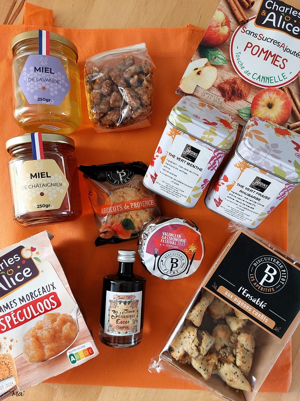 Comme il me restait plein de Goutatou, je suis revenue le dimanche en fin de matinée. J’ai ainsi pu me composer un brunch entre sucré et salé : de la pogne, des glaces, des bouchées salées et sucrées… J’ai également fait quelques achats, en particulier du miel de l’Ain (qui était un des départements invités de cette édition du festival), du vinaigre balsamique produit en Ardèche, des sablés fourrés fabriqués à Tain l’Hermitage, des compotes, de quoi préparer du thé glacé et des chouchous à base de noix de Grenoble.