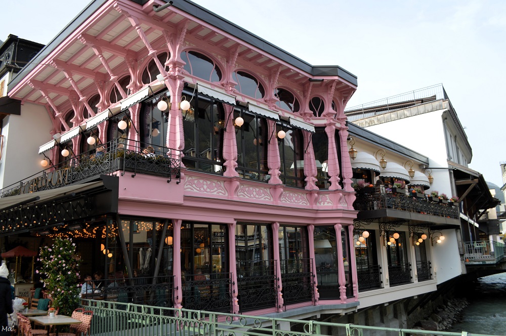 Comme aucune accalmie ne se profilait, nous avons pris le temps d’une longue pause goûter. Nous avons opté pour un établissement emblématique de Chamonix : l’ancien bar de la terrasse, récemment rénové et renommé « Rose du Pont ». Avec sa façade Art Nouveau toute rose située le long de l’Arve, il est difficile de le manquer. Lors de notre arrivée, une serveuse nous a conseillé de nous installer à l’étage, plus cosy avec ses canapés. Nous avons choisi une table dans une petite alcôve surplombant la rivière (et d’où la vue par beau temps sur les montagnes et en particulier le Mont Blanc doit être magnifique). Et nous avons passé presque une heure à discuter, tout en savourant notre goûter, avant de repartir à la gare.