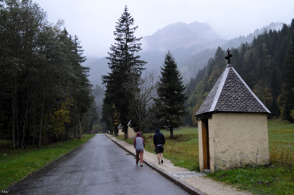 La pluie nous fait hâter le pas sur la route d’accès, bordée d’un chemin de croixEglise baroque au cœur des montagnes