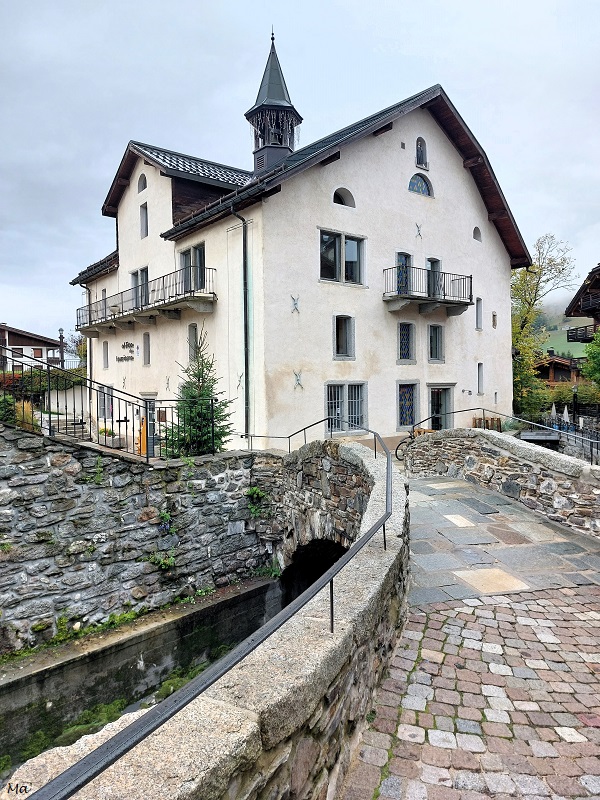 L’office de tourisme et le mignon petit pont de pierre sur la rivière à Megève