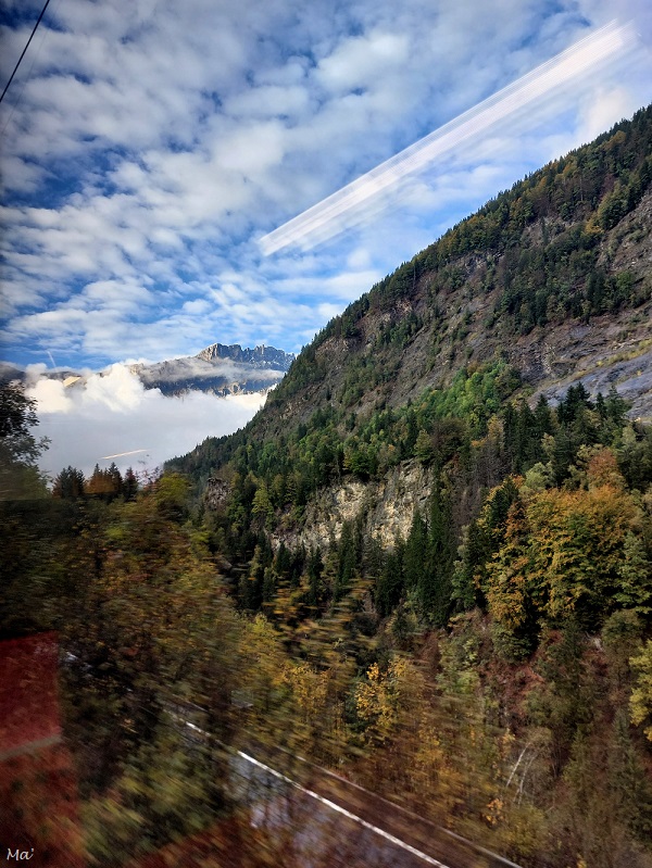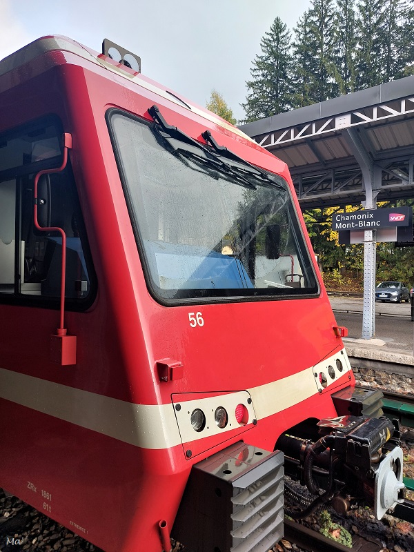 Afin de bénéficier de jolis paysages et d’une expérience de voyage, tout en restant au sec, nous avons pris le Mont Blanc Express entre la gare de Saint Gervais les Bains-Le Fayet et celle de Chamonix (nous aurions bien poussé l’expérience jusqu’en Suisse mais la suite du trajet était desservie uniquement par car ce jour-là en raison de travaux). Au fil du parcours dans la vallée, nous avons pu profiter des fenêtres panoramiques de ce train particulier. La ligne a en effet été construite au début du XXe siècle et est l’un des lignes de train les plus pentues de France sans crémaillère ou câble. C’est un véritable voyage qui nous emmène dans les paysages automnaux, au fil des petites gares et haltes, parfois desservies uniquement à la demande.
