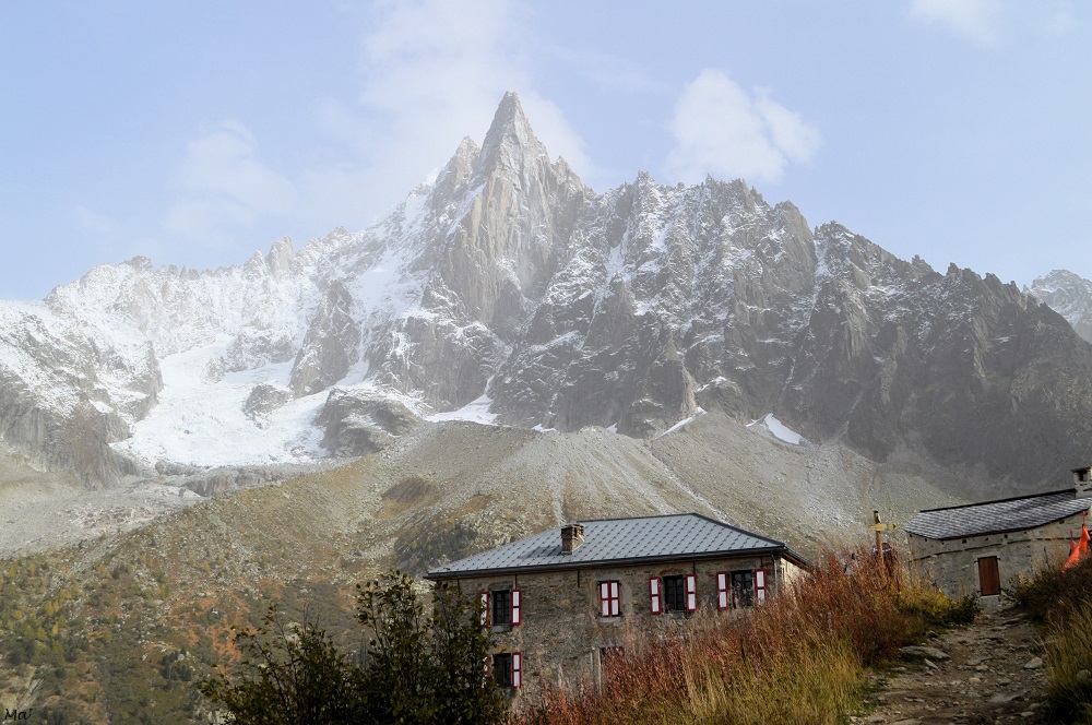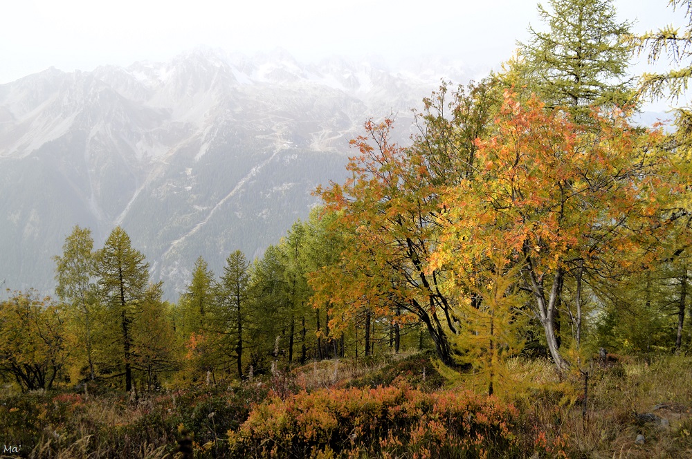 En cette fin octobre, de nombreux travaux avaient lieu au Montenvers afin de prolonger un peu la voie ferrée et de construire un nouveau téléphérique permettant aux visiteurs de s’approcher à nouveau du glacier sans trop de difficultés. En conséquence, le téléphérique existant était à l’arrêt et nous n’avons pas pu descendre vers le glacier (il est possible de le faire à pied mais nous n’étions pas équipés en conséquence et n’en avions pas le temps avant le dernier train de retour). Aussi, nous avons choisi de nous éloigner de la foule très présente sur la terrasse panoramique en faisant une balade sur l’autre versant de la montagne. Passant derrière l’hôtel du Montenvers, nous avons pris la direction du Plan de l’Aiguille. Nous savions que nous n’aurions pas le temps d’aller jusqu’au bout mais nous avons bien profité d’une jolie balade dans la montagne parée de ses couleurs automnales.