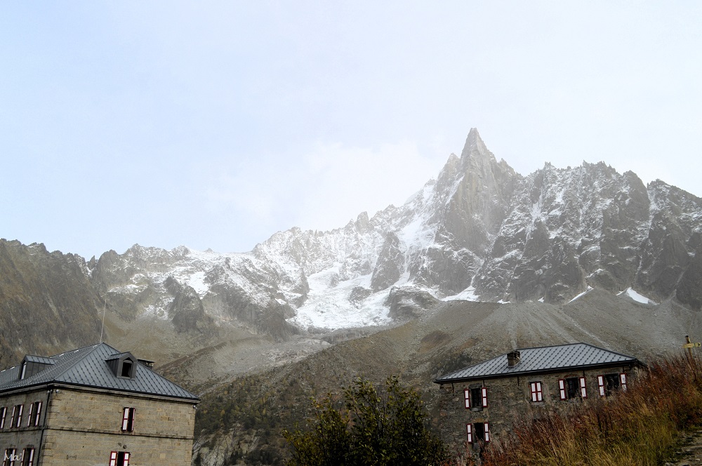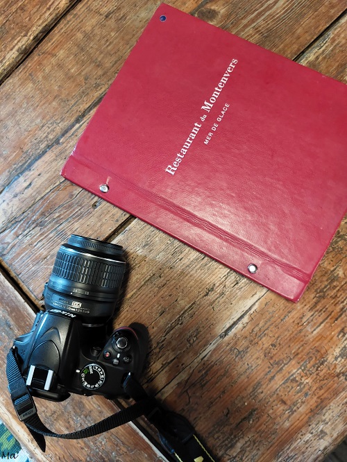 (*) Le train du Montenvers a sa propre gare, située derrière la gare SNCF et accessible via une passerelle au dessus de la voie ferrée. Les horaires et tarifs sont disponibles sur le site internet de Mont Blanc Natural Resort qui gère les remontées mécaniques sur Chamonix. Il est possible de prendre ses billets l’avance via internet. Comme nous n’étions pas sûr du jour où nous irions, nous avons acheté nos billets en arrivant sur place. A cette période de l’année, nous n’avons pas eu à attendre. Il est possible de dormir au refuge du Montenvers, d’y déjeuner ou juste d’y prendre une boisson. En été, une terrasse fait face aux Drus, tout comme la véranda. L’intérieur de cet établissement historique a le charme de la montagne d’antan.