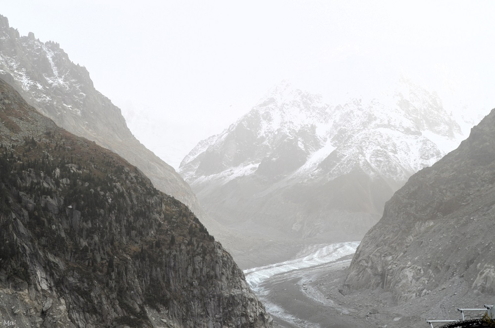 Comme notre première (demie) journée sur place était annoncée comme la plus belle niveau météo, nous avons filé sur Chamonix après le bref arrêt à la cascade de l’Arpenaz. Nous souhaitions en effet aller voir la Mer de Glace. Nous avons donc pris nos billets à la gare du Montenvers et attendu le train suivant. Ce petit train à crémaillère nous a monté jusqu’au Montenvers, à 1913 mètres d’altitude, en une vingtaine de minutes à flanc de montagne. Le paysage depuis le petit train est impressionnant et l’on s’élève progressivement au dessus de la vallée de Chamonix jusqu’à arriver face aux Drus. En sortant de la gare, notre premier constat a été que la Mer de Glace nous a semblé bien lointaine. Si on voit très nettement la vallée morainique et le niveau que le glacier pouvait attendre, on ne voit plus vraiment la Mer de Glace au pied du Montenvers.