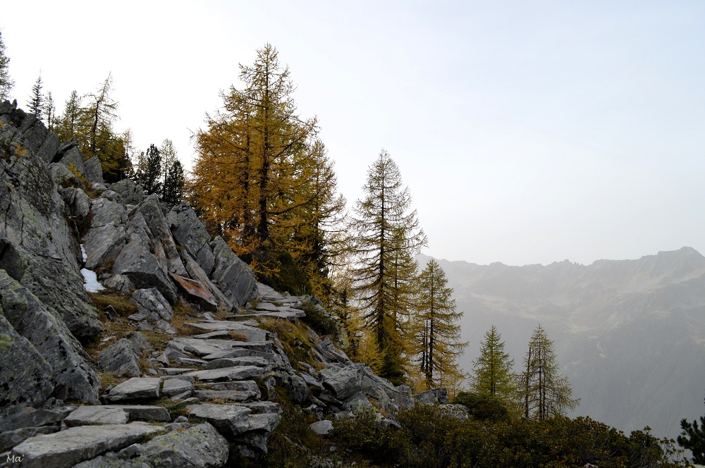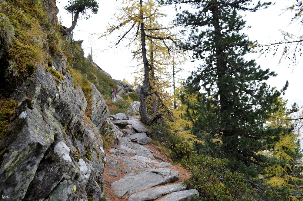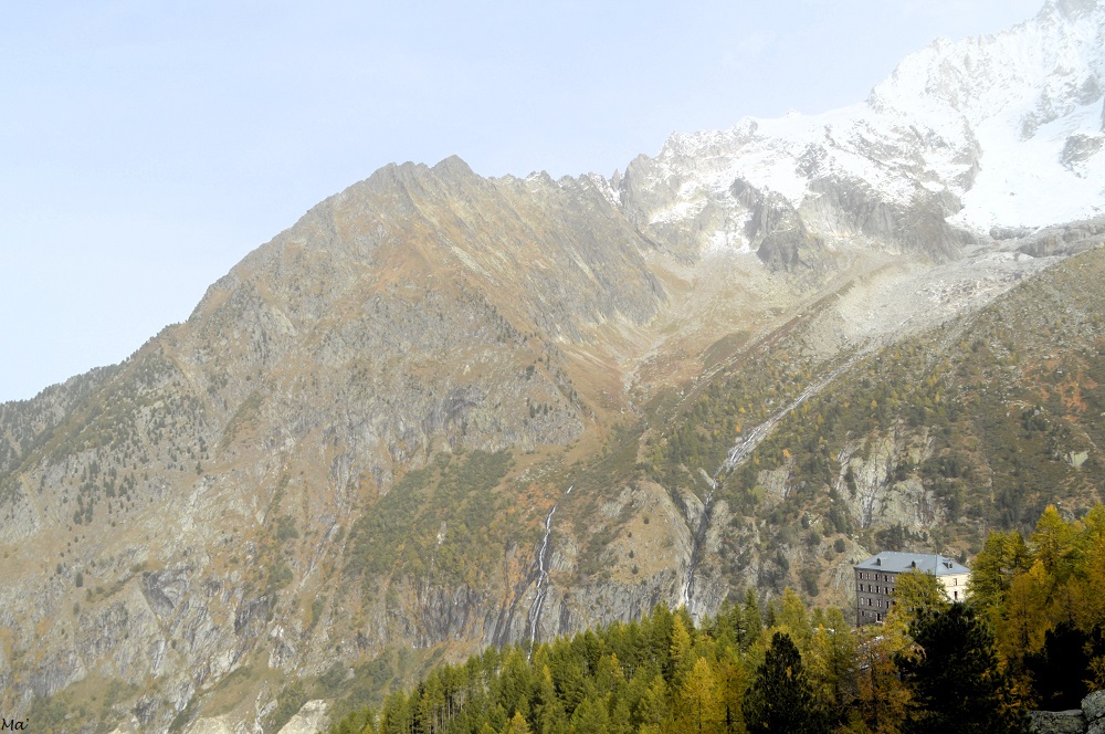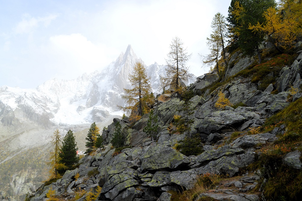 Le chemin, bien visible, s’élève à flanc de montagne entre les mélèzesOn s’élève assez rapidement. Preuve en est, le Grand Hôtel du Montenvers qui parait tout petit.Mélèzes d’automne au pied des DrusQuelques traces de neige rappellent que l’hiver approcheCouleurs d’automneMythiques Drus